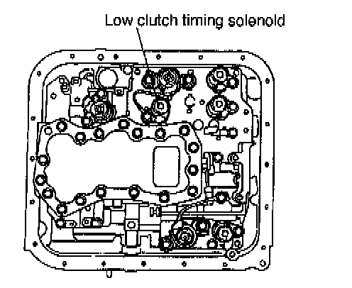 This solenoid is mounted to the control valve, and it is turned ON or OFF according to the signal sent from the TCM. It then controls the low clutch timing valve B and reverse inhibit valve.