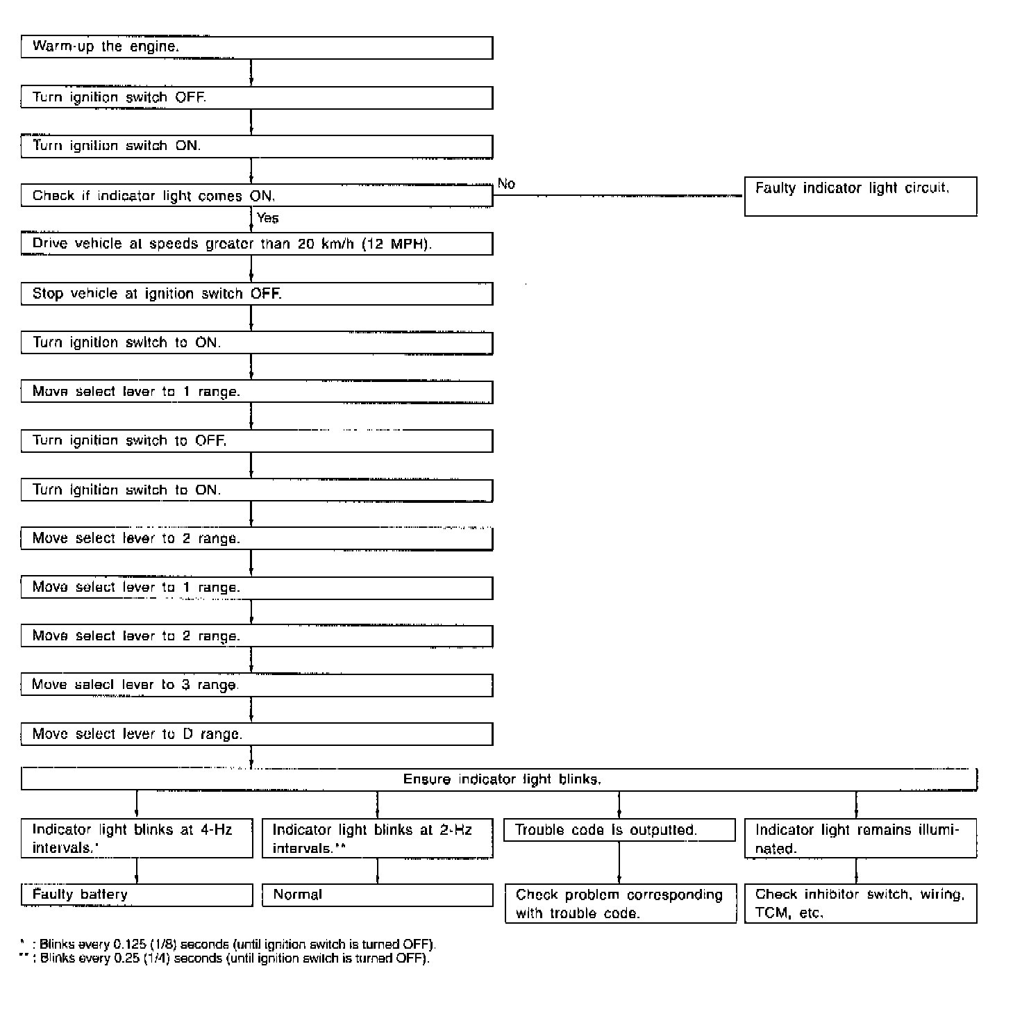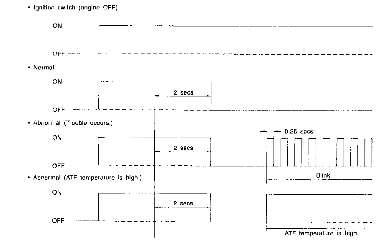 When any on-board diagnostics item is malfunctioning, the display on the AT OIL TEMP indicator light blinks from the time the malfunction is detected after starting the engine until the ignition switch is turned OFF. The malfunctioning part or unit can be determined by a trouble code during on-board diagnostics operation. Problems which occurred previously can also be identified through the memory function. If the AT OIL TEMP indicator does not show a problem (although a problem is occurring), the problem can be determined by checking the performance characteristics of each sensor using the select monitor. Indicator signal is as shown in the figure.
