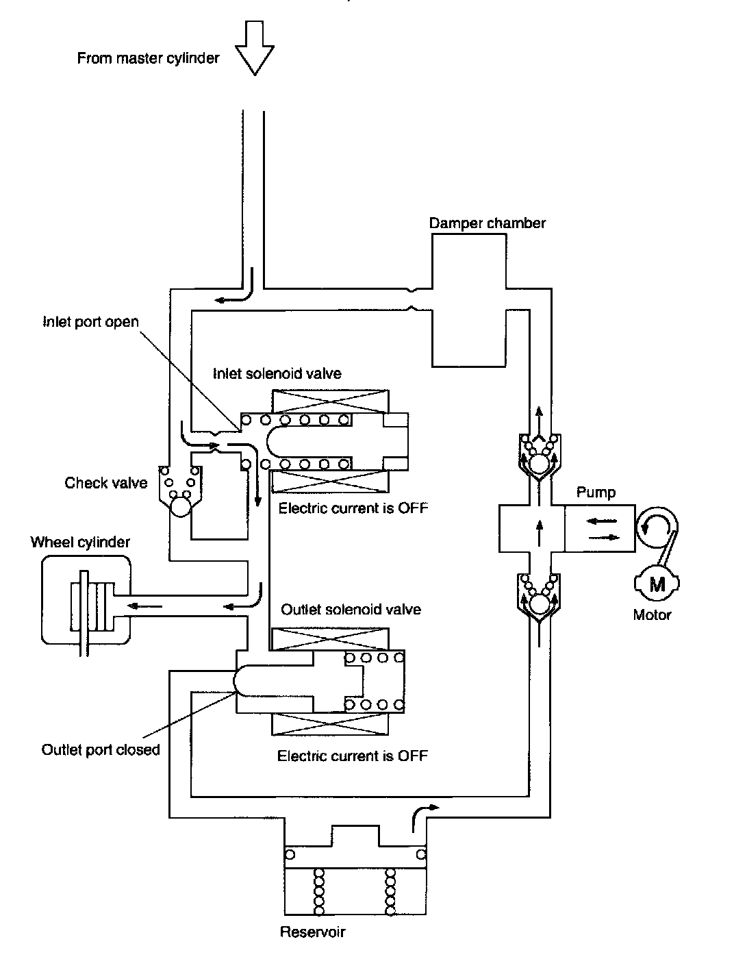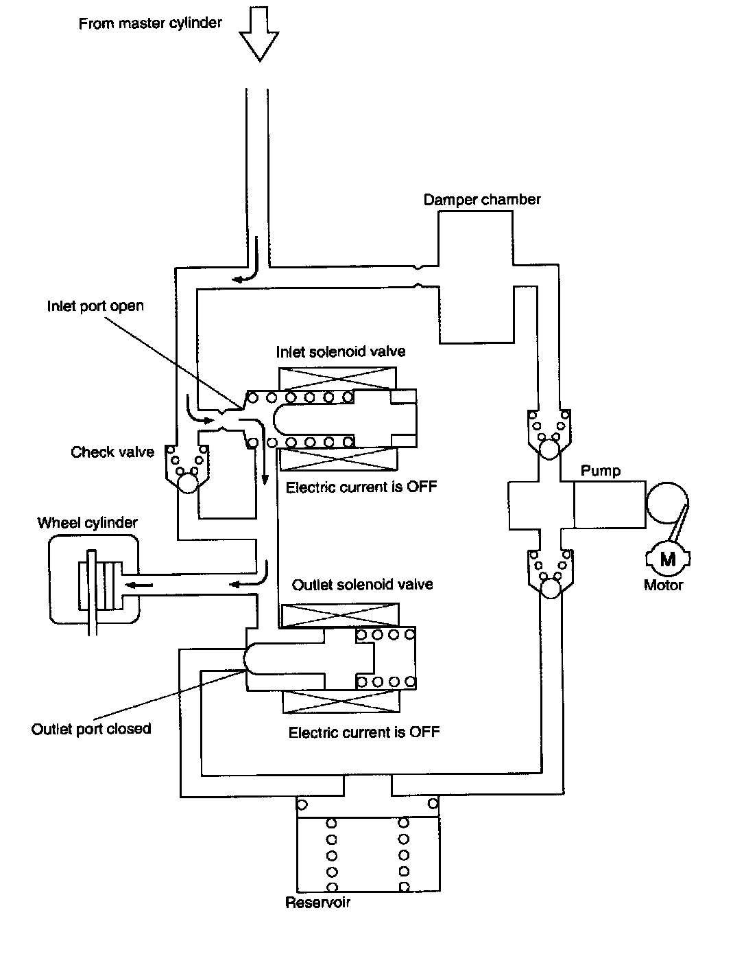 Since no current is supplied to the inlet and outlet solenoid valves, no solenoid valve attracting force is generated. So the valves remain stationary. Accordingly, the inlet port of the inlet solenoid valve is in an opened state, whereas the outlet port of the outlet solenoid valve is in a closed state. So the fluid pressure of the master cylinder is transmitted to the wheel cylinder to increase the brake force in the wheel cylinder. During Anti-lock Brake System (ABS) operation, the pump motor continues to operate.