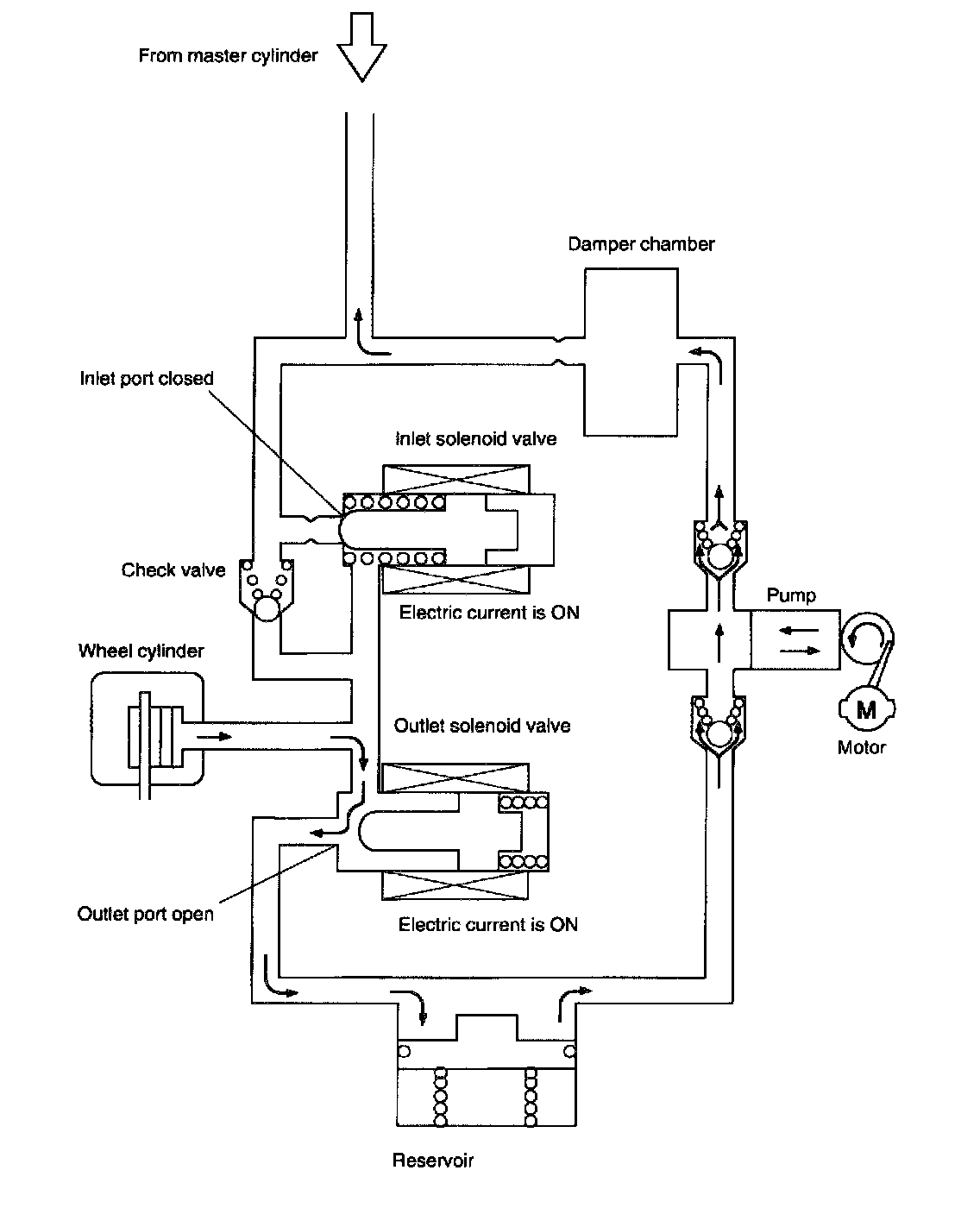 - The solenoid valve is a 2-position type solenoid valve which switches the brake fluid passages between the wheel and master cylinder and reservoir sides in response to an instruction from the ABSCM. For each wheel cylinder, a pair of normally-closed and -opened solenoid valves are provided.
