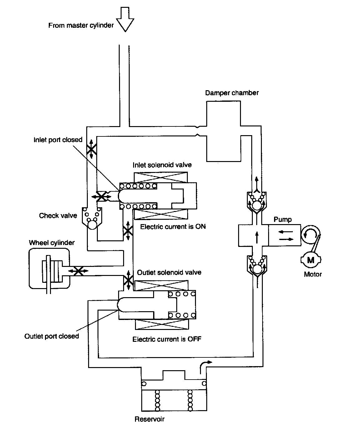 Current is supplied to the inlet solenoid valve, and the generated solenoid valve attracting force closes the inlet port. Since no current is supplied to the outlet solenoid valve, the output port remains in a closed state. As a result, the wheel cylinder, master cylinder and reservoir are blocked, and the fluid pressure of the wheel cylinder is maintained constant. During Anti-lock Brake System (ABS) operation, the pump motor continues to operate.
