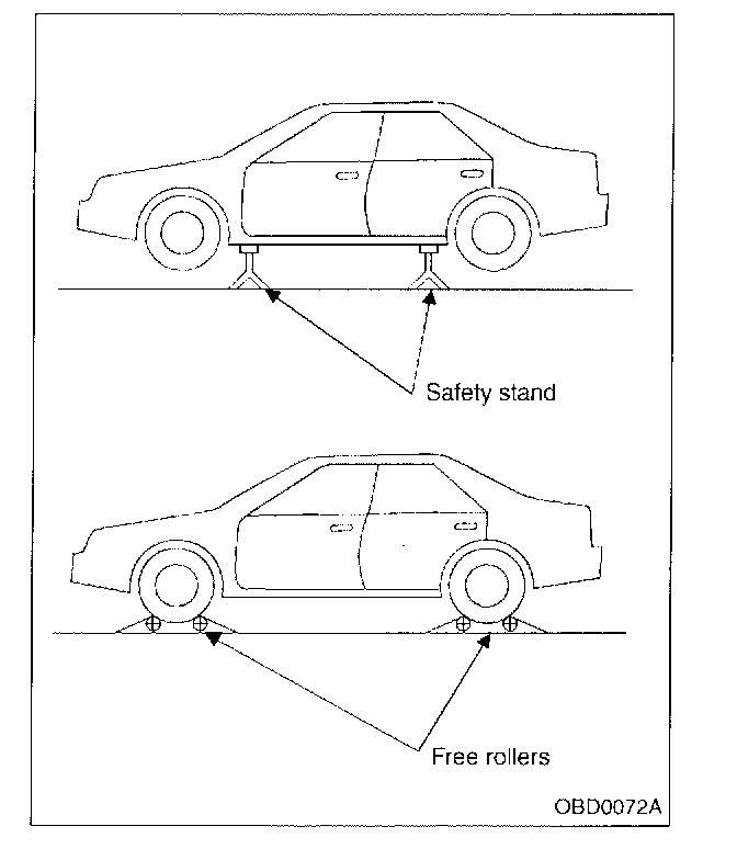 - In order to prevent the vehicle from slipping due to vibration, do not place any wooden blocks or similar items between the safety stands and the vehicle.