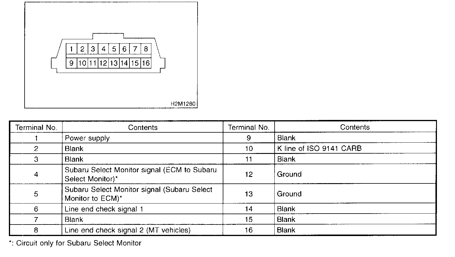 1. This connector is used both for OBD-II general scan tools and the Subaru Select Monitor.