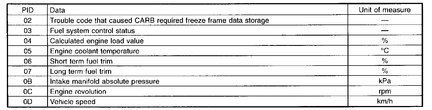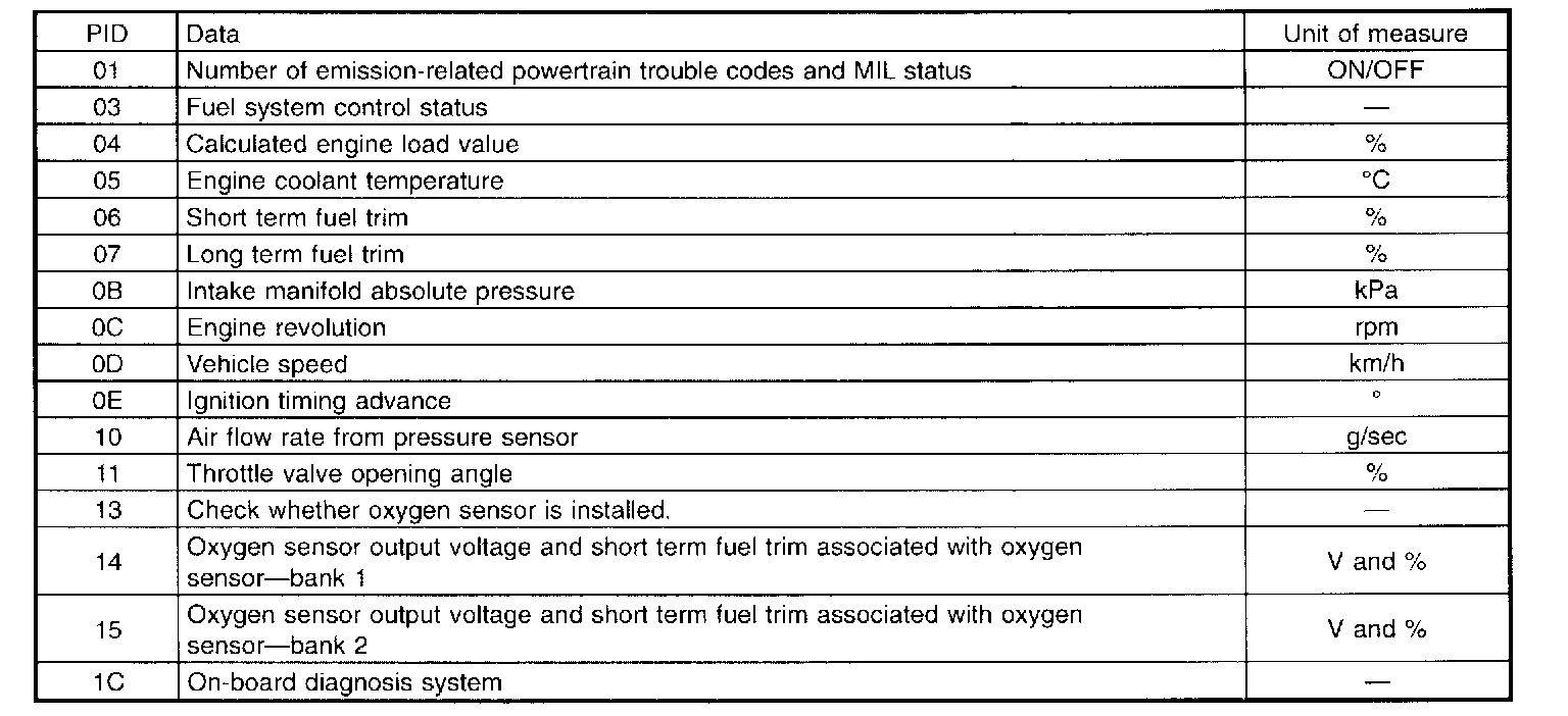 A list of the support data and PID (Parameter Identification) codes are shown in the following table.