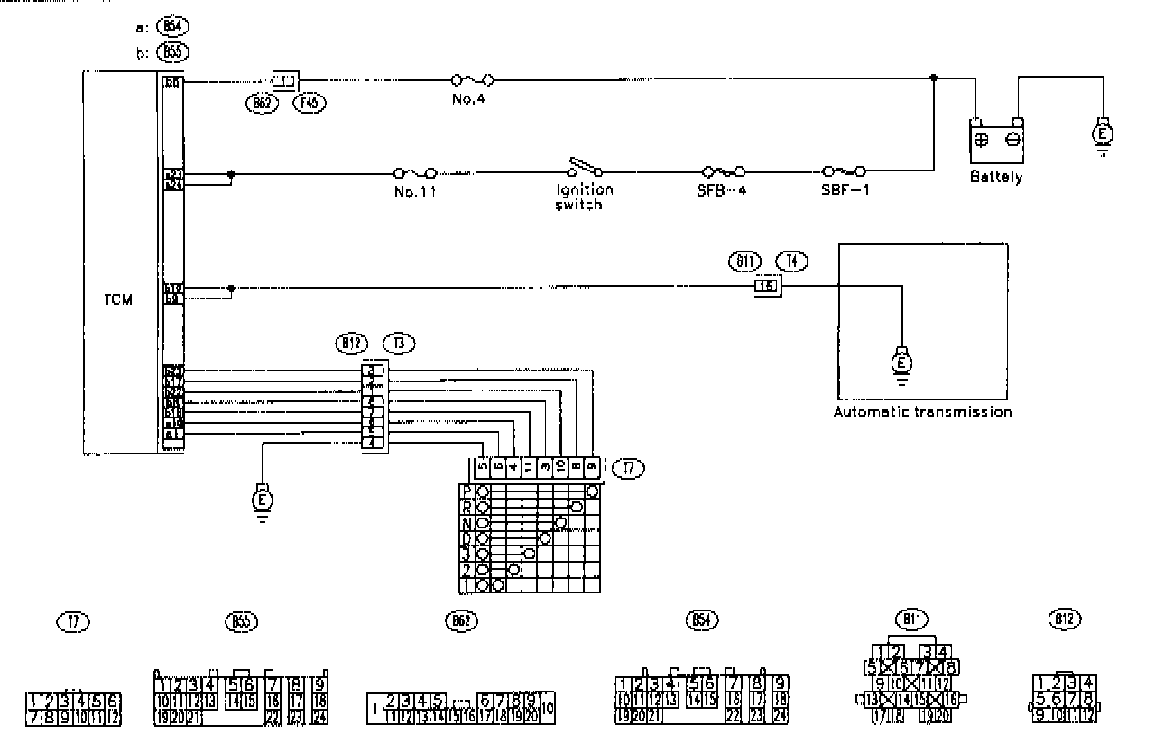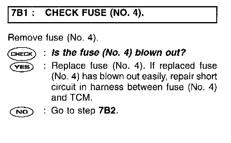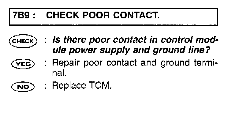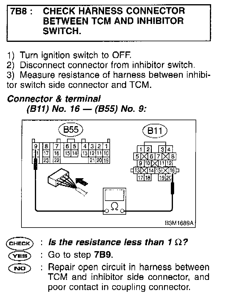 7B8: CHECK HARNESS CONNECTOR BETWEEN TCM AND INHIBITOR SWITCH.