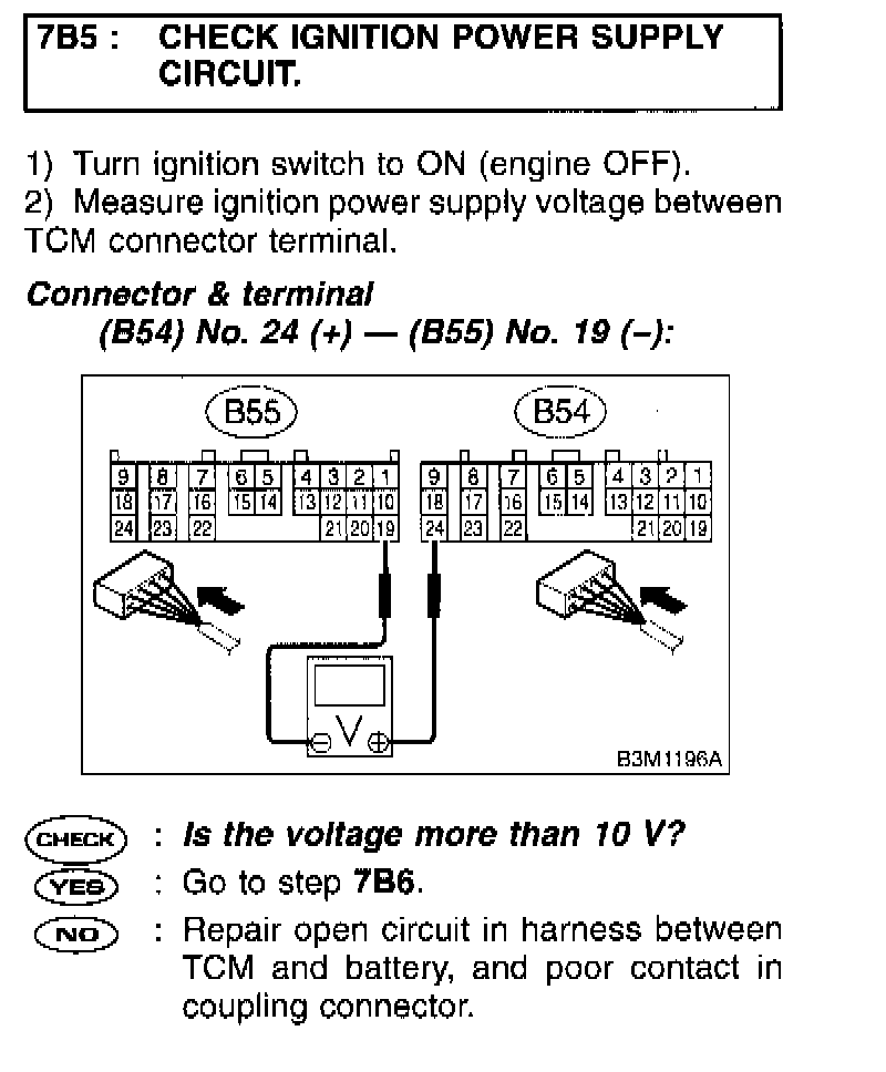 7B6: CHECK HARNESS CONNECTOR BETWEEN TCM AND TRANSMISSION.