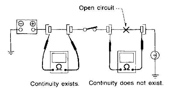 Disconnect all connectors affected, and check continuity in the wiring between adjacent connectors. When the ohmmeter indicates "infinite", the wiring is open.