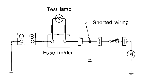 Connect a test lamp (rated at approximately 3 watts) in place of the blown fuse and allow current to flow through the circuit. Disconnect one connector at a time from the circuit, starting with the one located farthest from the power supply. If the test lamp goes out when a connector is disconnected, the wiring between that connection and the next connector (farther from the power supply) is shorted.