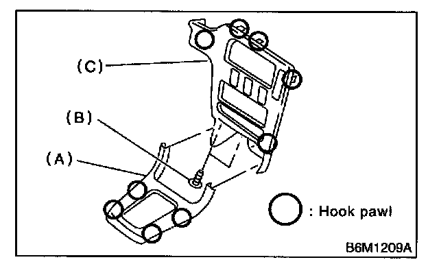 5. Remove two screws (B) and then remove center panel (C) while disconnecting connector.