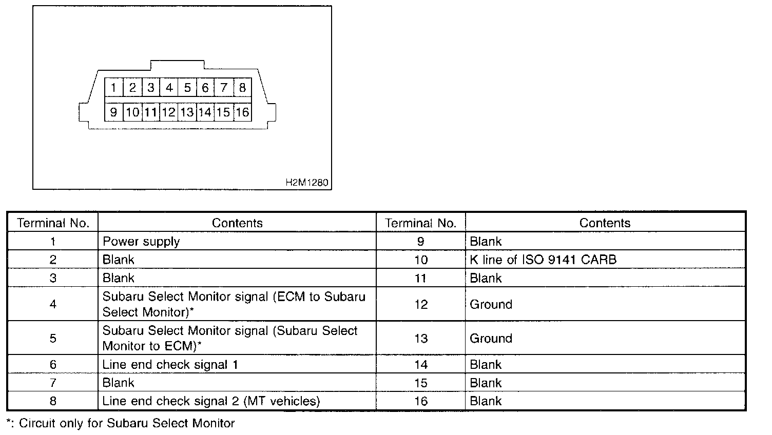 1. This connector is used both for OBD-II general scan tools and the Subaru Select Monitor.