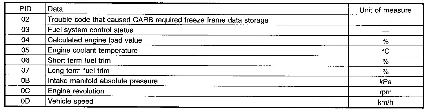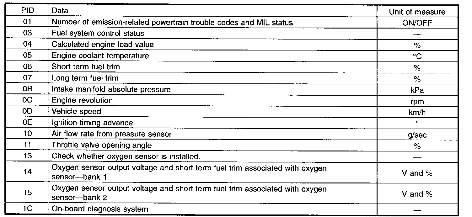 A list of the support data and PID (Parameter Identification) codes are shown in the following table.