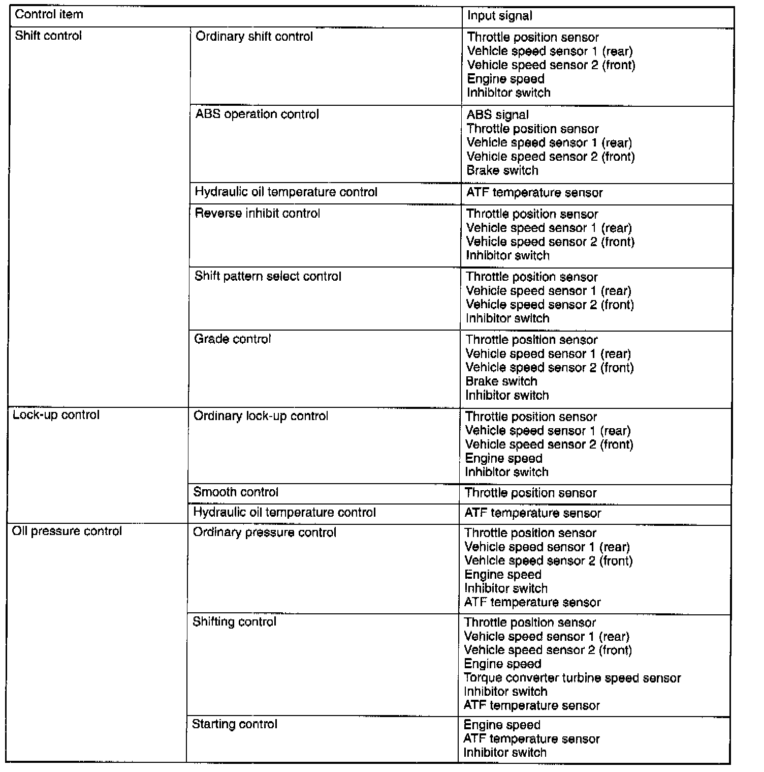 The lock-up engaging and disengaging conditions are set for 4th gear shift range, gear position and shift pattern and correspond to the throttle position and vehicle speed, and the duty solenoid electronically controlled by TCM controls the lock-up clutch. The lock-up clutch engagement and disengagement are controlled by the lock-up control valve.