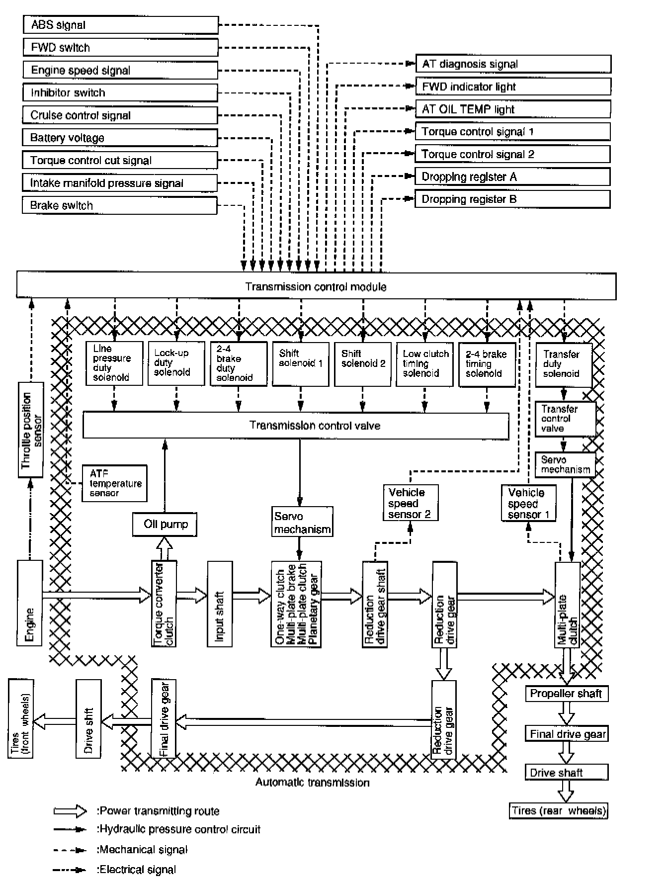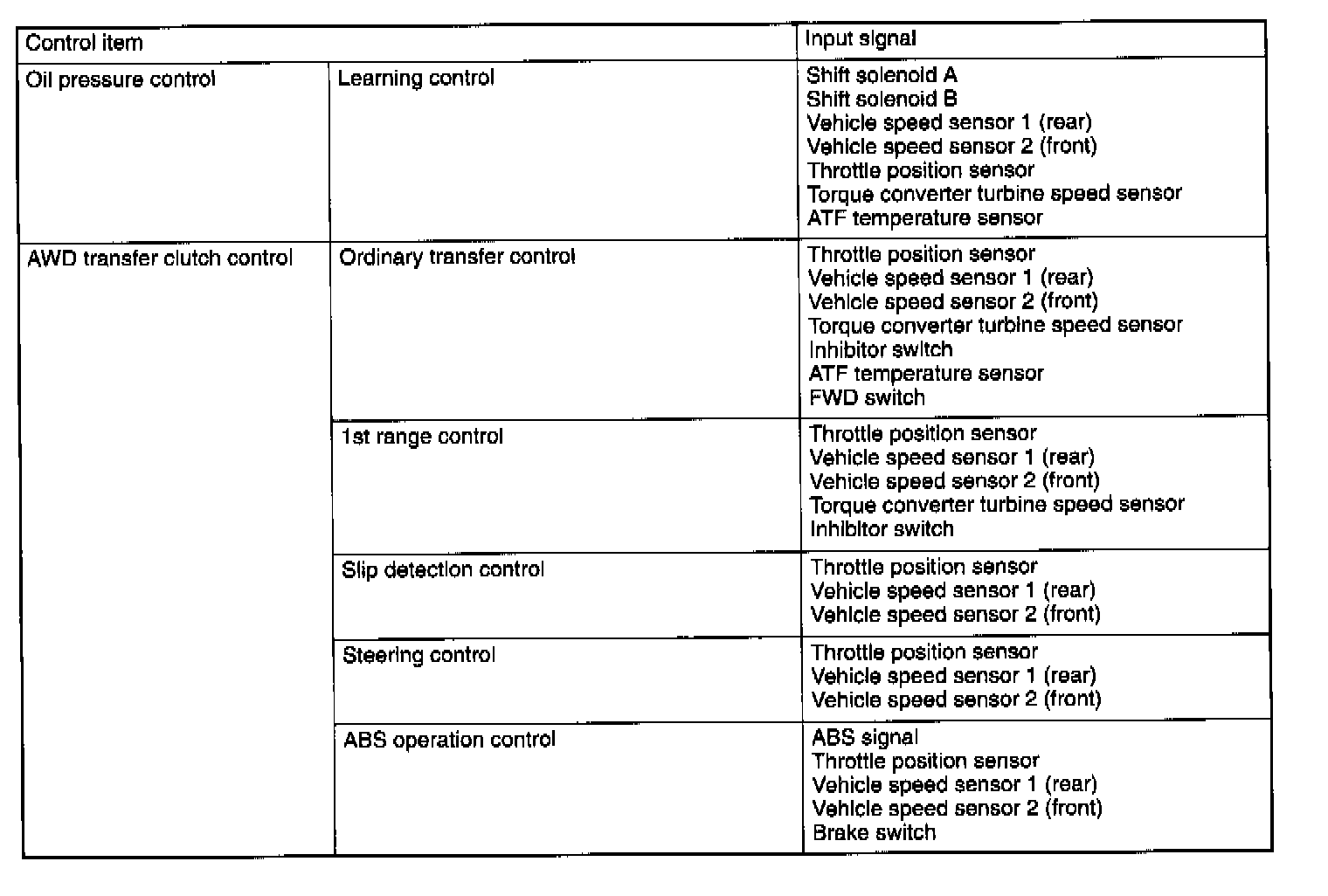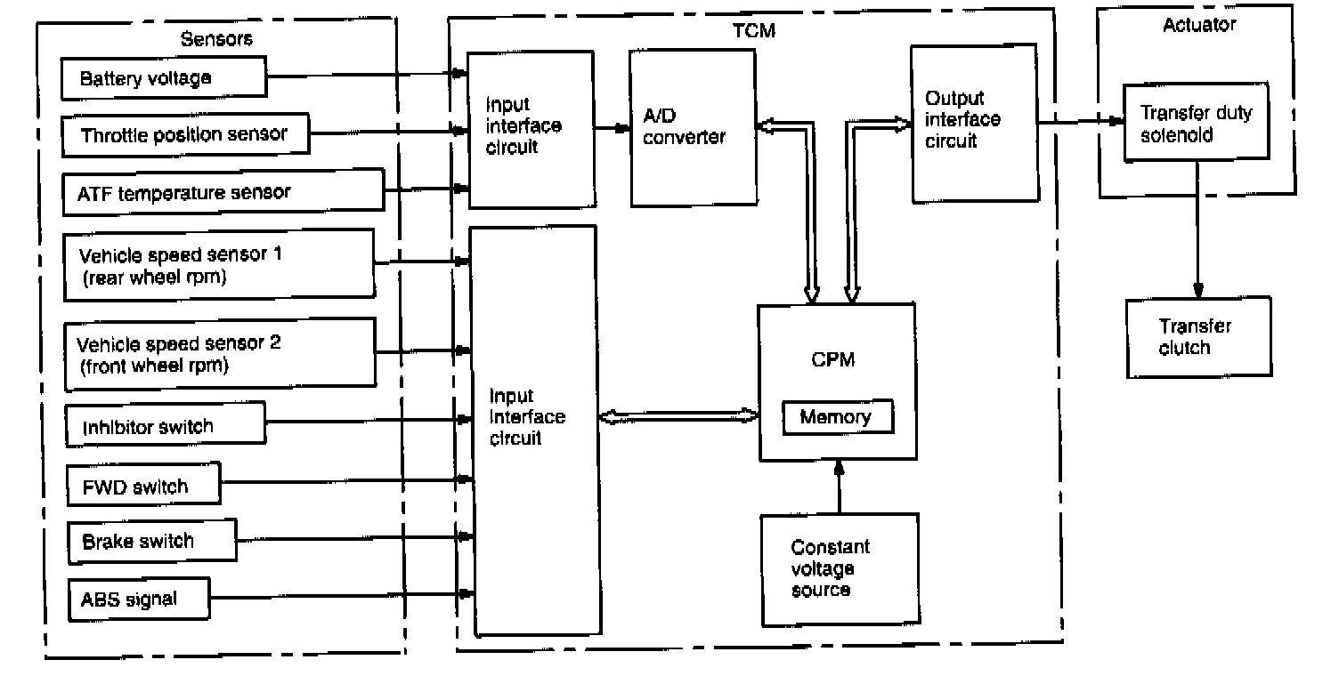 Transmission Control Module (TCM)TCM receives various sensor signals and determines the running conditions of the vehicle. It then sends control signals to each solenoid according to the preset gearshift characteristic data, lockup operation data, and transfer clutch torque data (duty ratio).