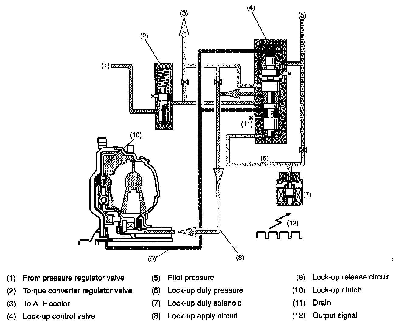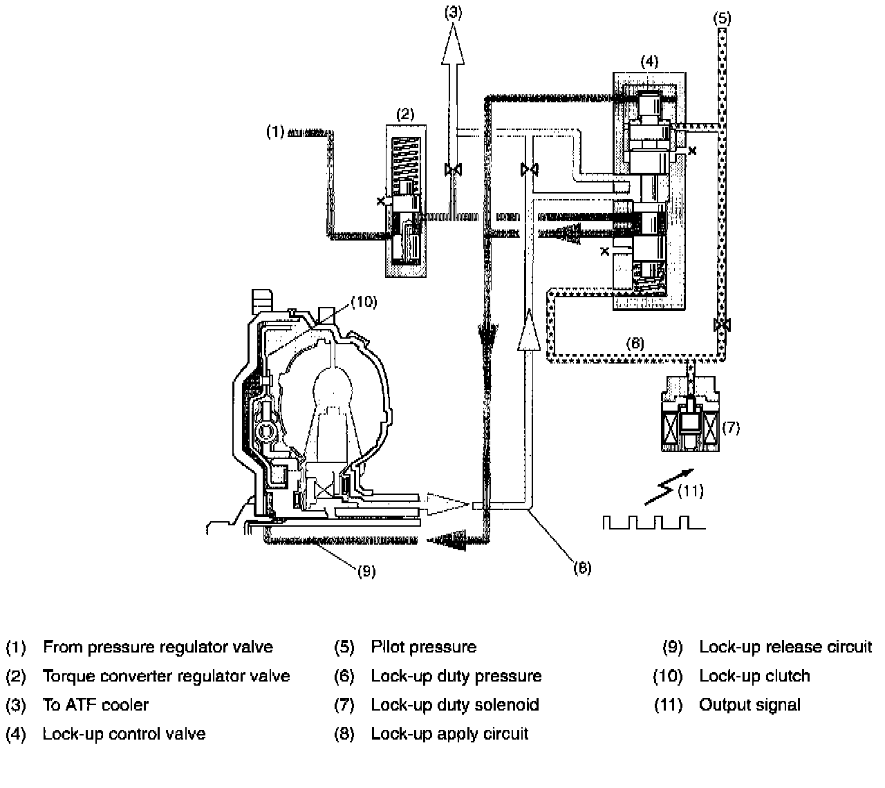 The Transmission Control Module (TCM) sends output signal to the lock-up duty solenoid. Since the lock-up duty solenoid operates in proportion to the duty ratio, the amount of ATF drained from there is increased, thus lock-up duty pressure being reduced.