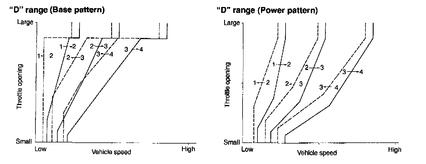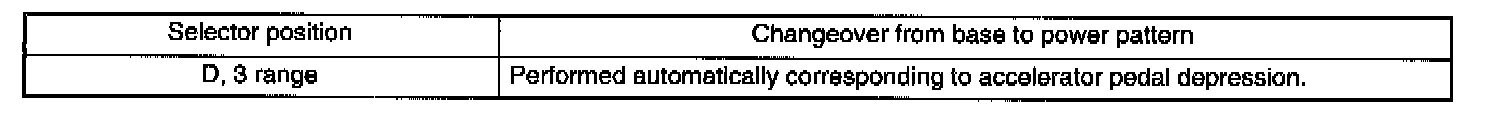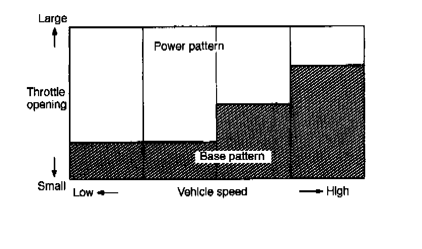 The power pattern is shifted to the base pattern, depending on car speed. Shifting to the base pattern is determined by the throttle position as shown in Figure below. Time lag in shifting is also determined by car speed. The maximum time lag is 3 seconds.