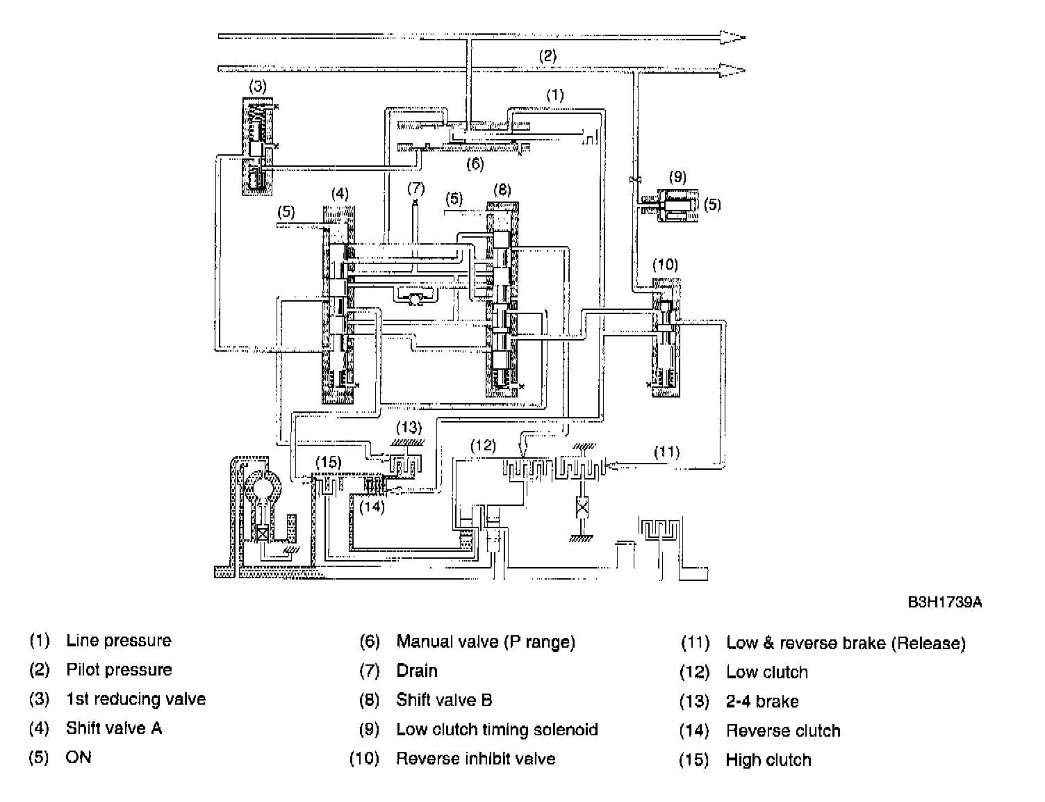 In this condition, the low & reverse brake does not engage since the ATF flowing from the manual valve is blocked by the reverse inhibit valve.