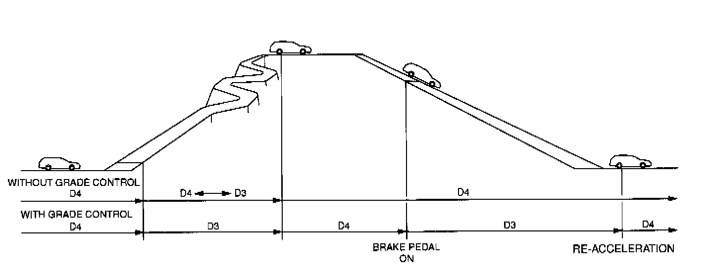 When a vehicle is descending a steep hill under the designated vehicle speed (approximately 50 miles/hour), 4th gear downshifts to 3rd gear automatically by depressing the brake pedal. This gearshift control is released by re-accelerating with depressing the accelerator pedal. These controls are doing this based on the combination of throttle opening angle, engine speed, vehicle speed and so on.