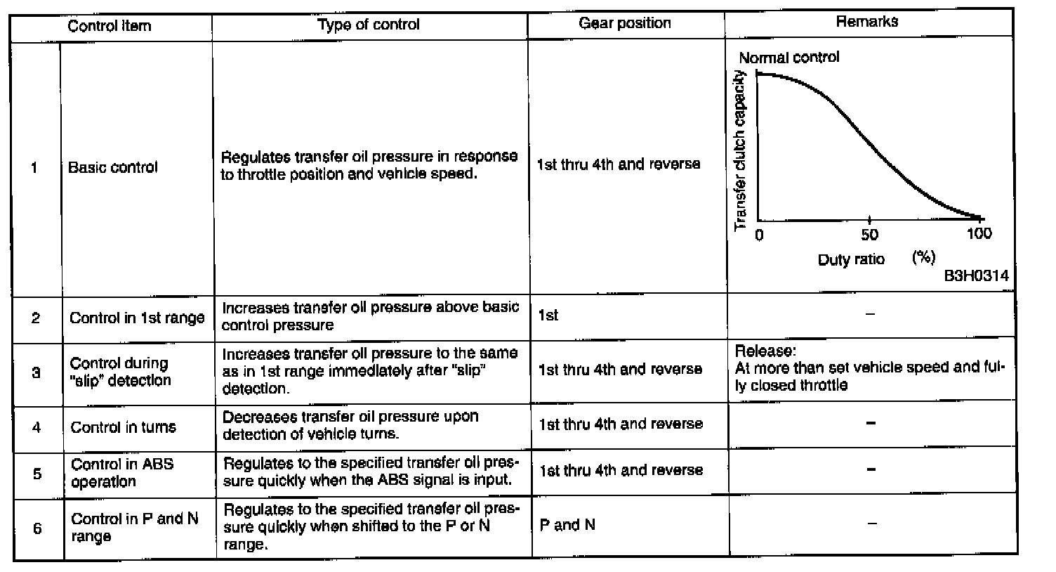 The hydraulic oil pressure (line pressure) is regulated by the transfer duty solenoid and transfer control valve for obtaining optimum rear torque distribution corresponding to the driving conditions.