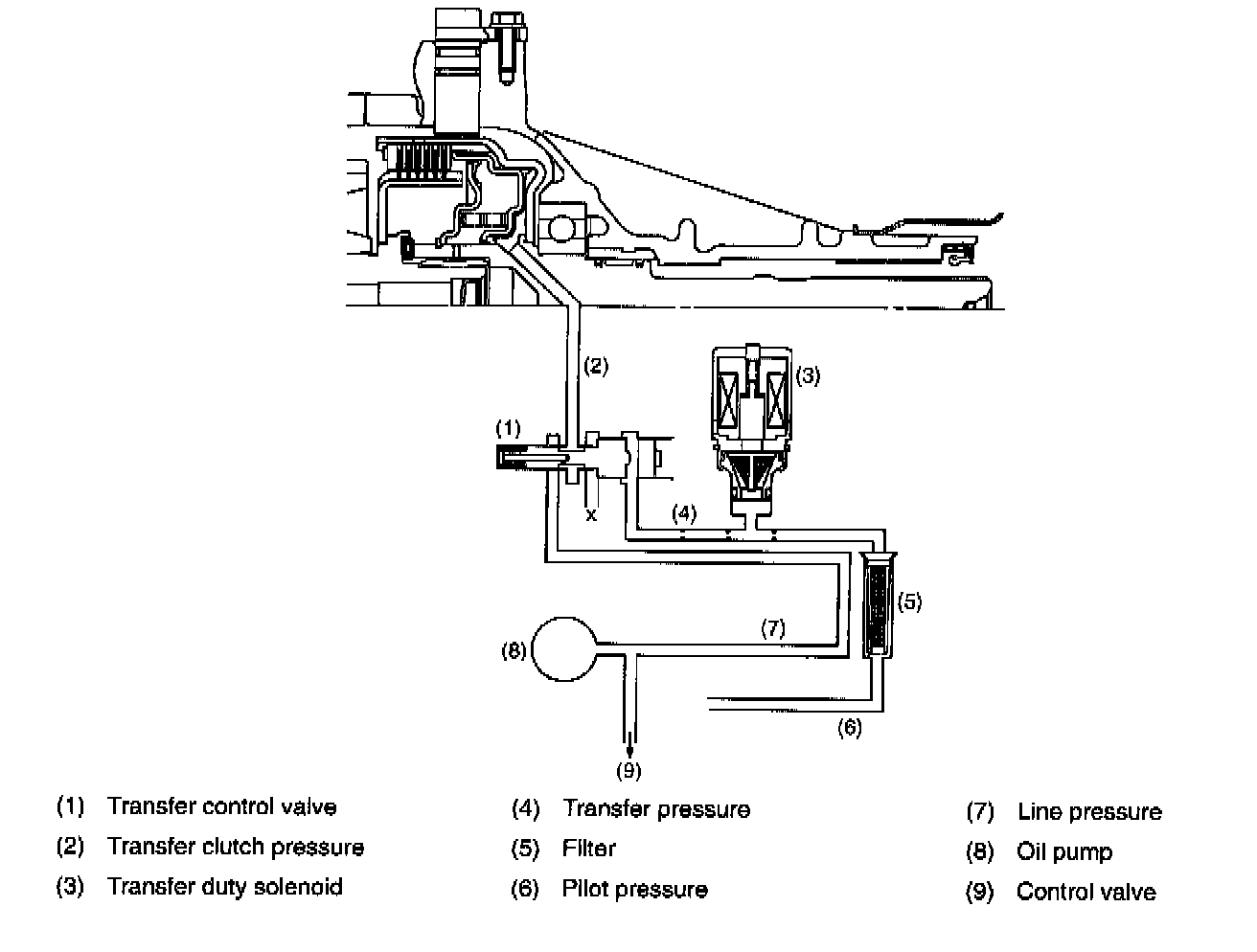 ^ The line pressure is led also to the transfer control valve where the pressure is regulated to the transfer clutch pressure by the transfer duty pressure. (The transfer clutch pressure varies with the transfer duty pressure.)