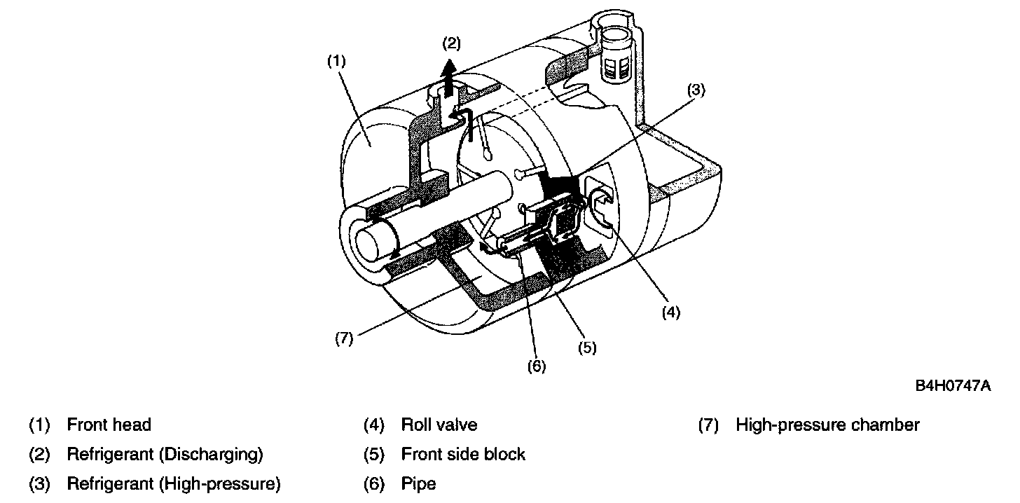When the refrigerant pressure in the cylinder chamber exceeds the high pressure value, the roll valve opens to discharge the refrigerant through the pipe portion jointly provided in the front side block into the high pressure chamber in the front head. The gaseous refrigerant in the high pressure chamber is led through a baffle to separate the compressor oil contained in the gaseous refrigerant before it is forced to the high pressure piping.