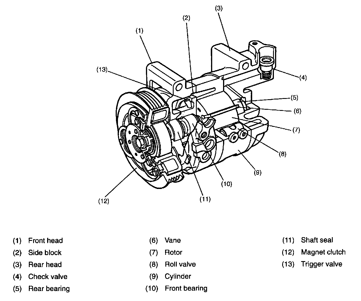 CompressorThe vane rotary type compressor has five vanes fitted in the rotor mounted on the shaft. The centrifugal force produced by rotation of the rotor in the elliptical cylinder causes the vanes to move out and change the volumes in the areas surrounded by the rotor and cylinder. Suction compression and discharge take place 10 times per rotation. A roll type valve is used on the discharge side only. Shaft seals are provided for the shaft and front head to maintain air tightness in the compressor. A trigger valve is provided in the side block to apply a back pressure to the vanes. The compressor is charged with the specified quantity of compressor oil which is forced to all the parts for lubrication by the discharge pressure of the refrigerant.