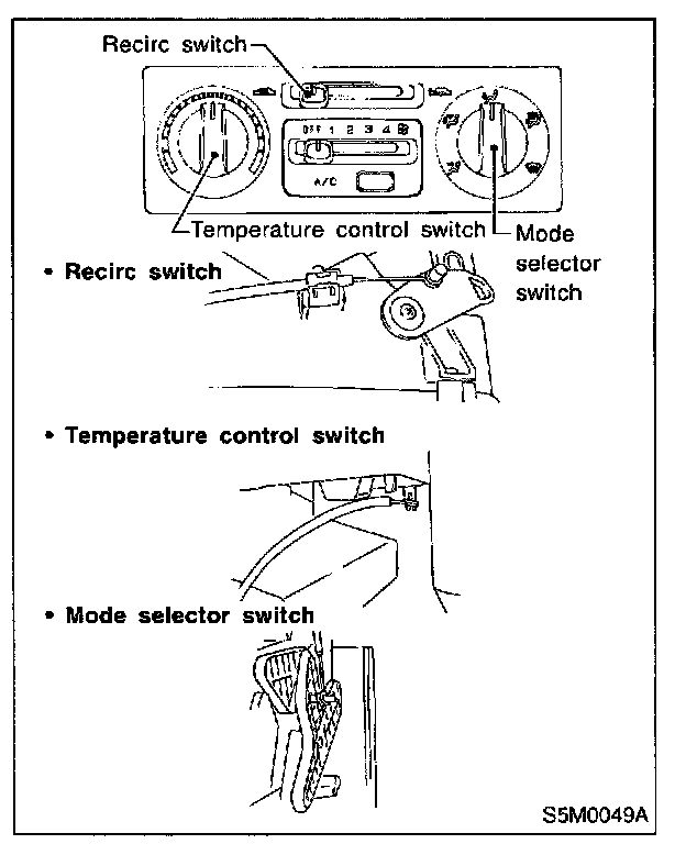 3. Disconnect temperature control cable and mode door control cable from heater unit then disconnect recirc control cable from intake unit.
