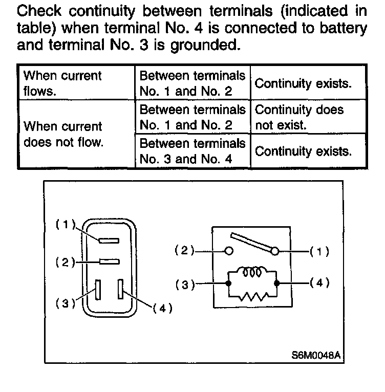 Check continuity between terminals when terminal No.4 is connected to battery and terminal No.3 is grounded.