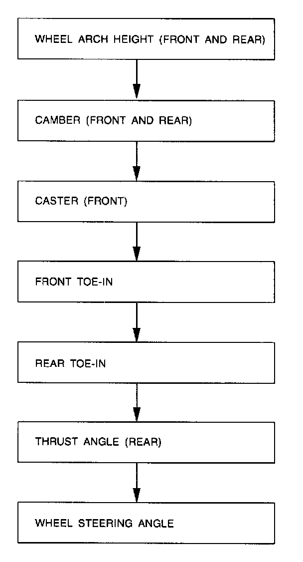 2. Set vehicle under "curb weight" conditions. (Empty luggage compartment, install spare tire, jack, service tools, and top up fuel tank.)