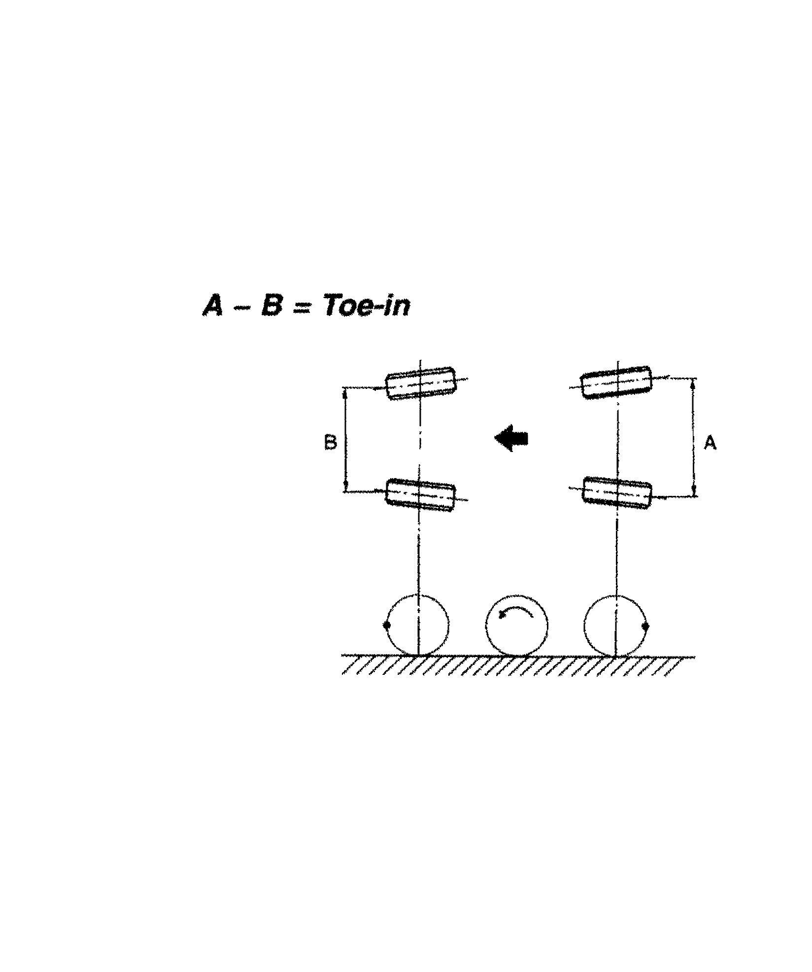 4. Measure distance "B" between left and right marks. Toe-in can then be obtained by the following equation: