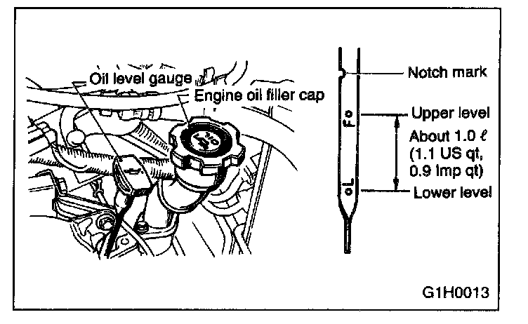 6. Just after driving or while the engine is warm, engine oil level may show in the range between the "F" line and the notch mark. This is caused by thermal expansion of the engine oil.