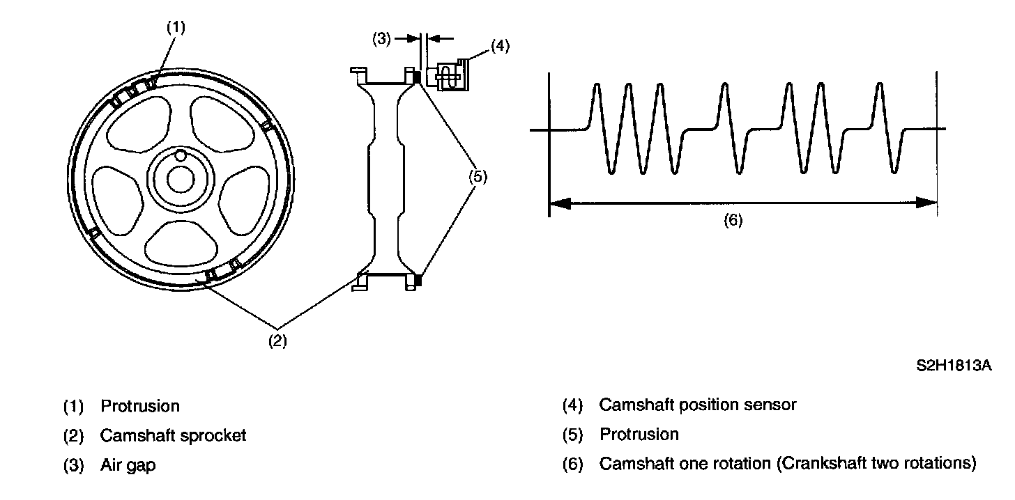 - It is designed so that the ECM accurately reads the number of pulses which occur when protrusions provided on the back of the left hand camshaft-drive sprocket cross the sensor. Internal construction and the basic operating principle of the camshaft position sensor are similar to those of the crankshaft position sensor. A total of seven protrusions (one each at two locations, two at one location and three at one location) are arranged in four equal parts of the sprocket.