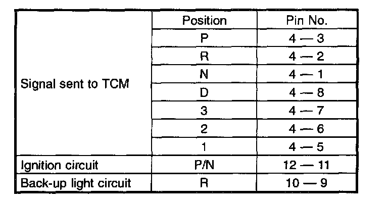 CAUTION: Also check that continuity in ignition circuit does not exist when select lever is in R, D, 3, 2 and 1 ranges.