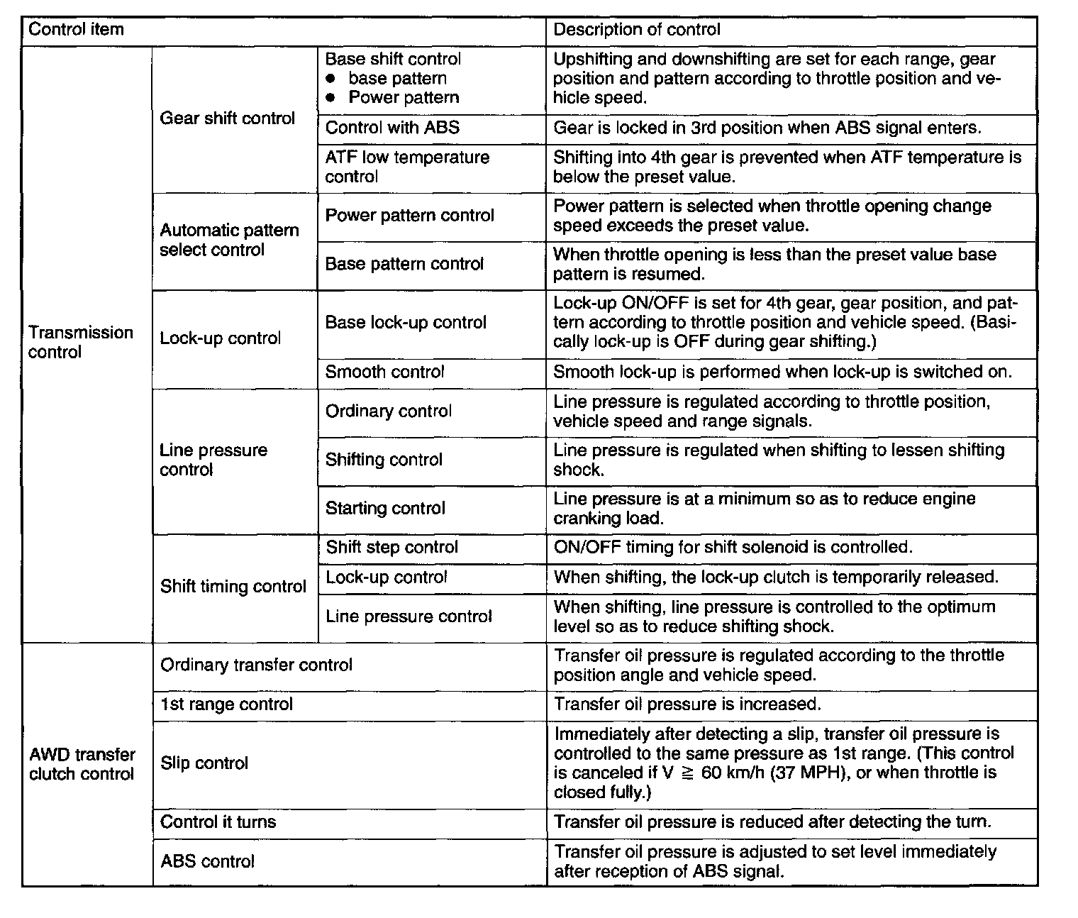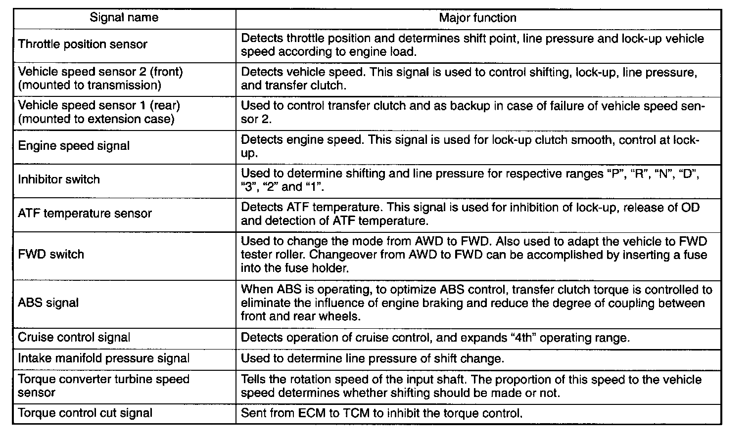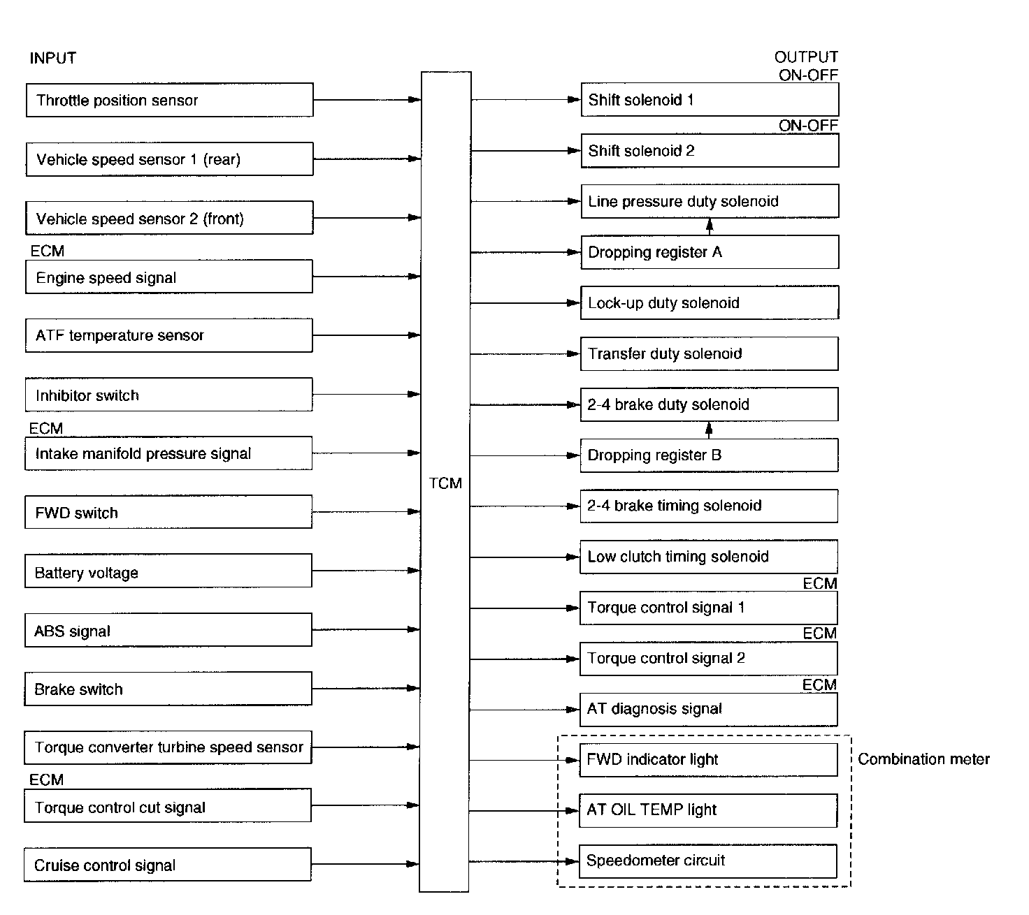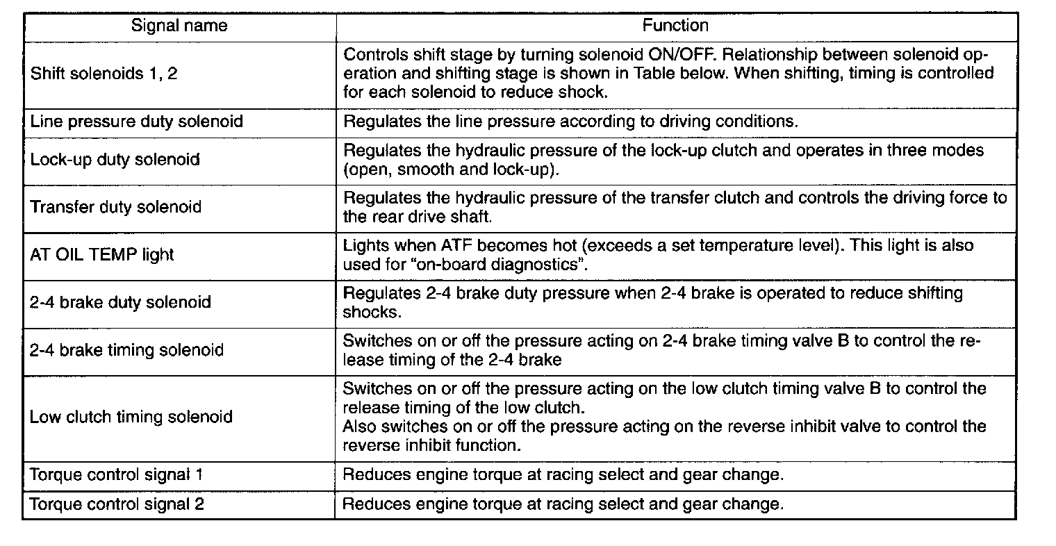 A: GENERALThe electronic-hydraulic control system consists of various sensors and switches, a transmission control module (TCM) and the hydraulic controller including solenoid valves. The system controls the transmission proper including shift control, lock-up control, timing control, reverse inhibit control, engine control, line pressure control, auto pattern select control and shift timing control. It also controls the AWD transfer clutch. In other words, the system detects various operating conditions from various input signals and sends output signals to shift solenoids 1 and 2, low clutch timing solenoid, 2-4 brake timing solenoid, line pressure, lock-up, transfer and 2-4 brake duty solenoids (a total of eight solenoids).