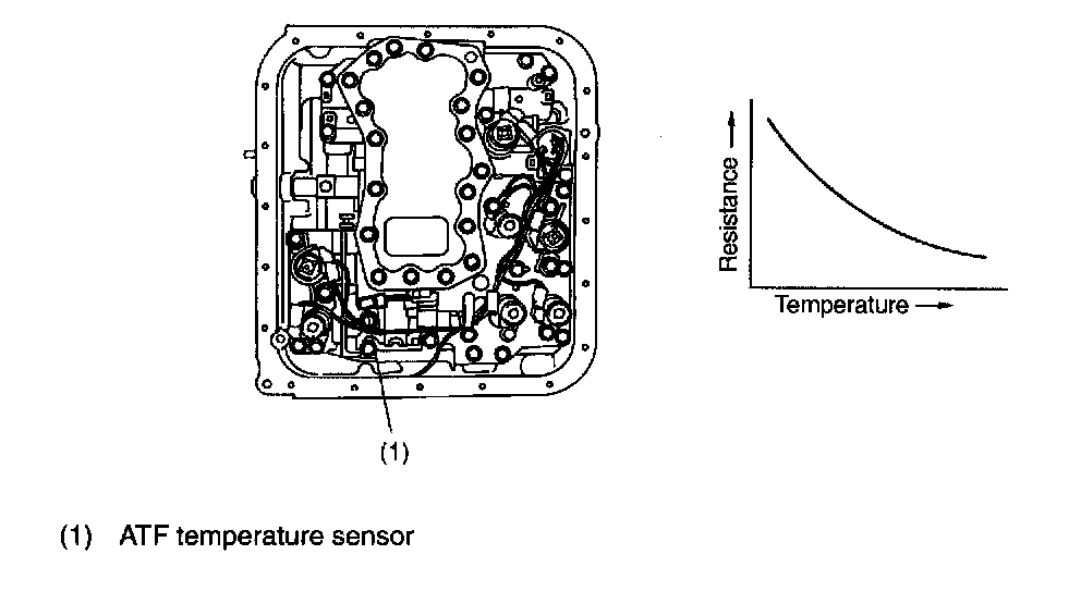 This sensor is mounted to the control valve in the transmission. It detects temperature change as an analog electrical signal. The output characteristics of the sensor are shown below.