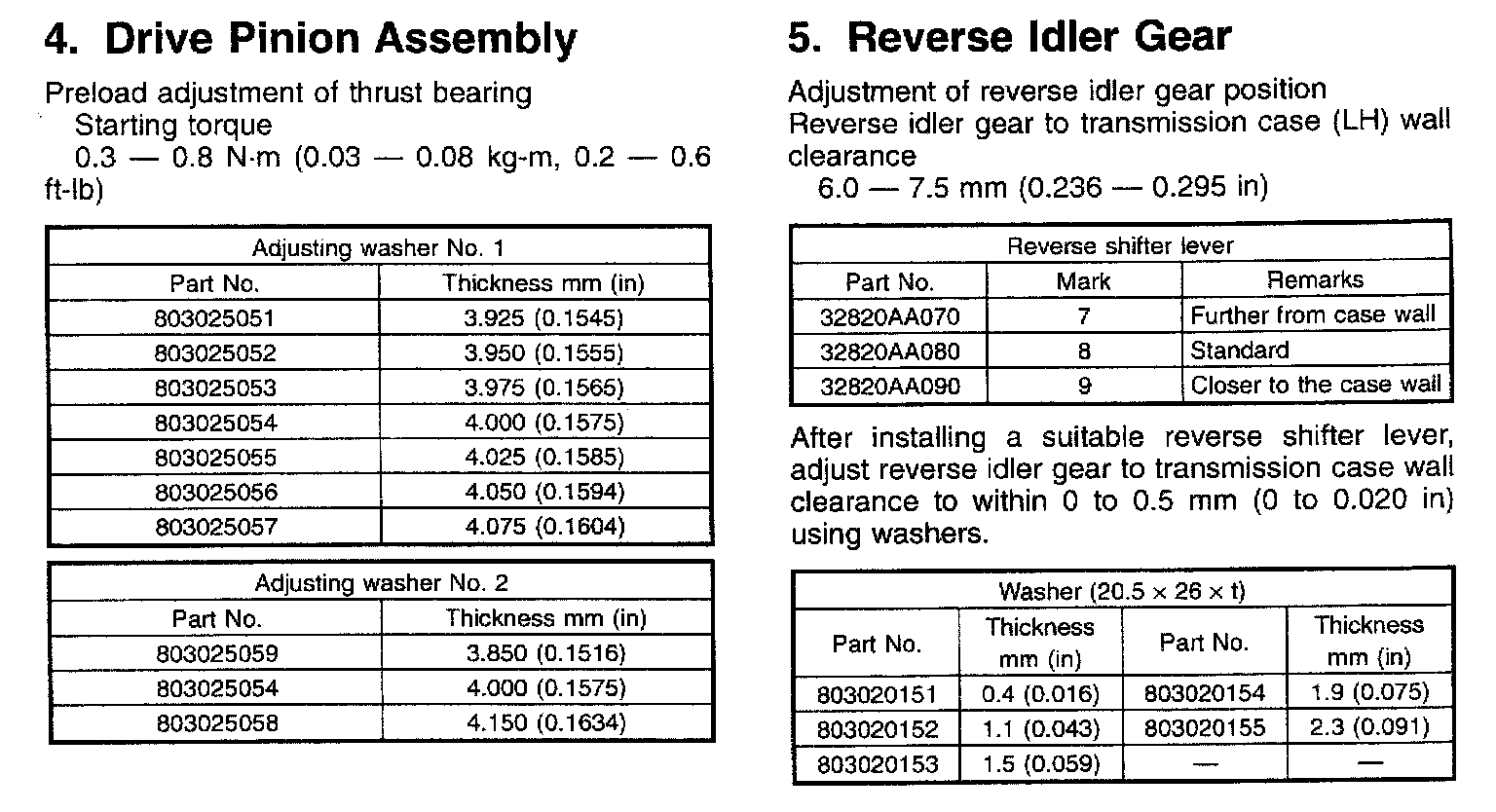 4-spd A/T, Transmission Drive Pinion Shim Application: