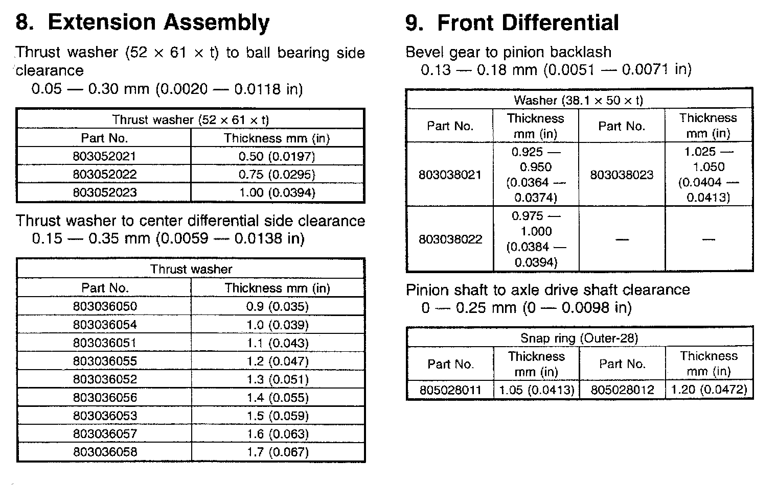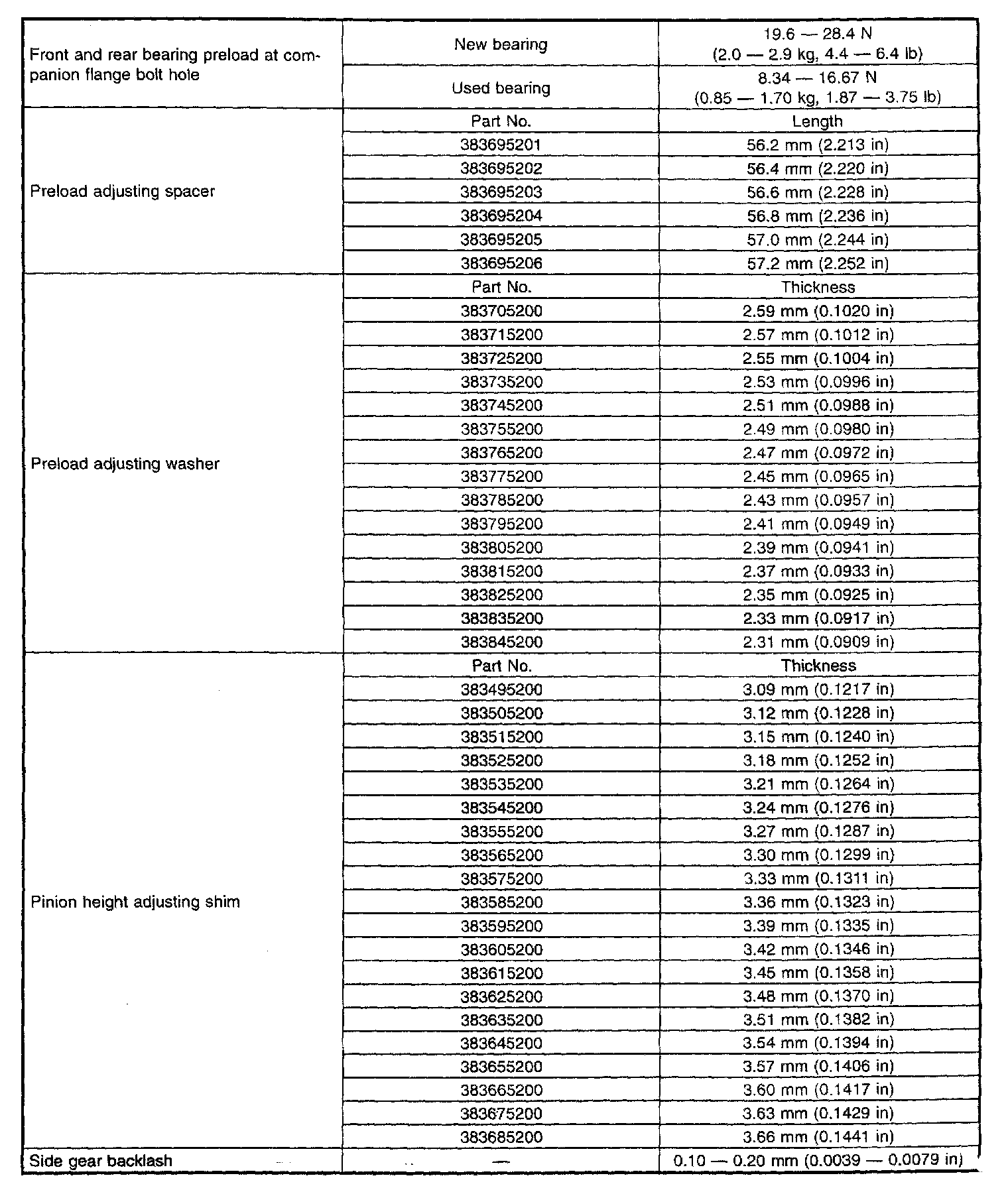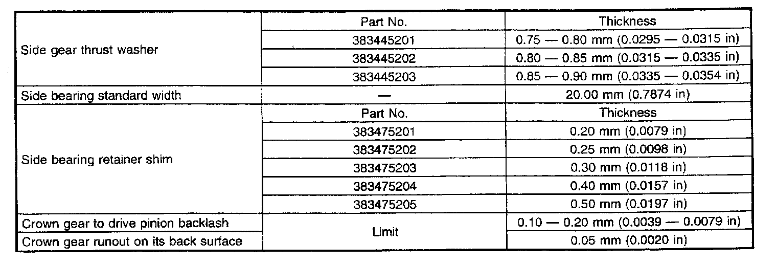 Rear Differential Service / Overhaul Data: