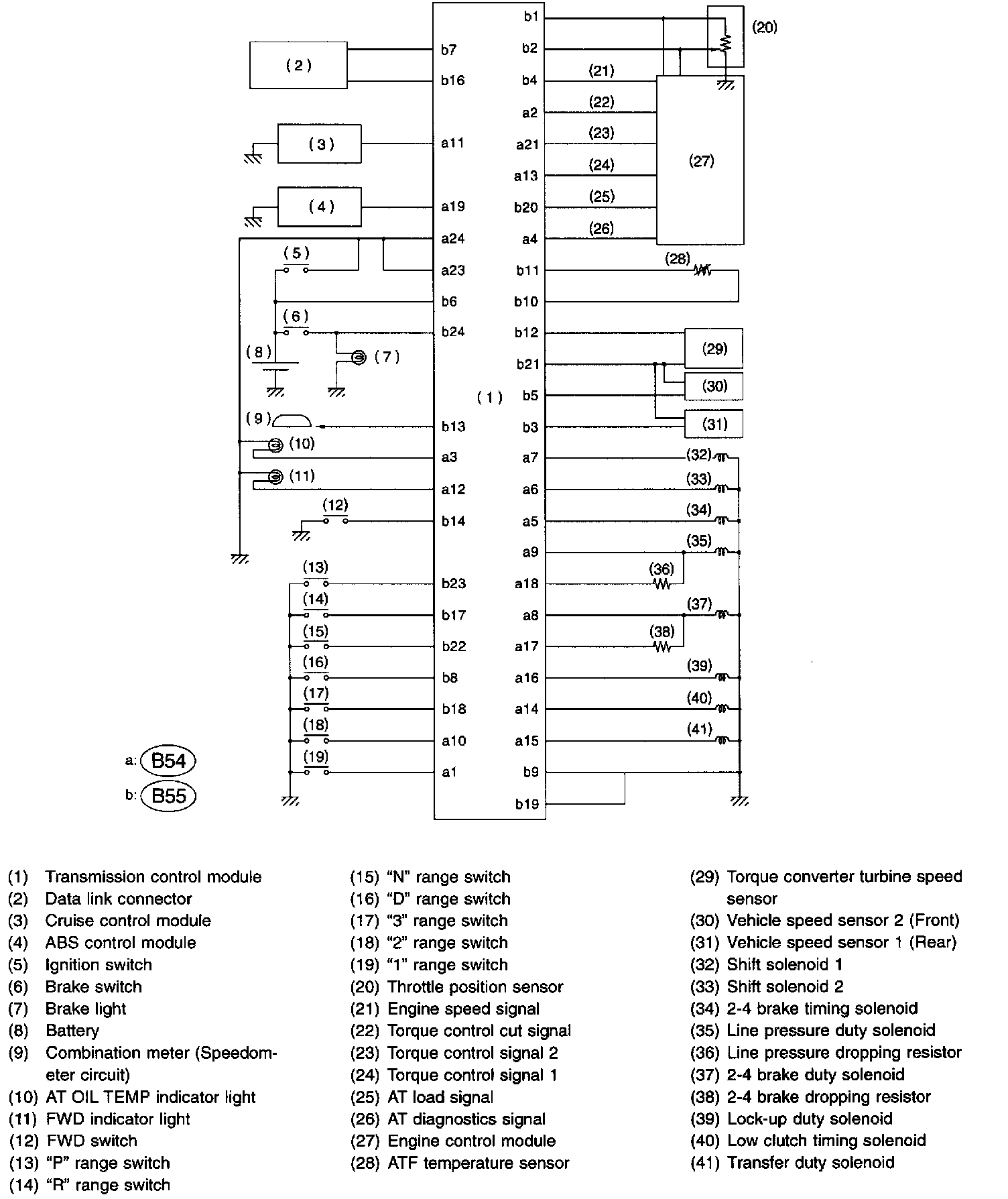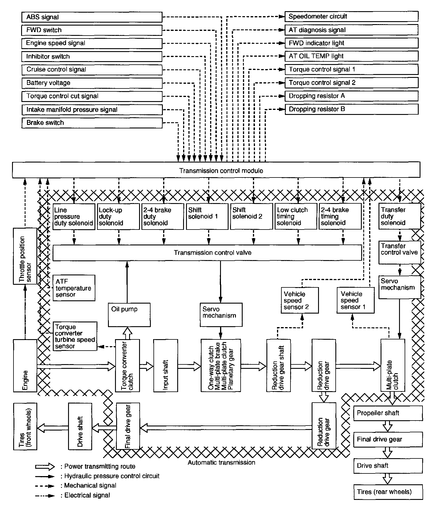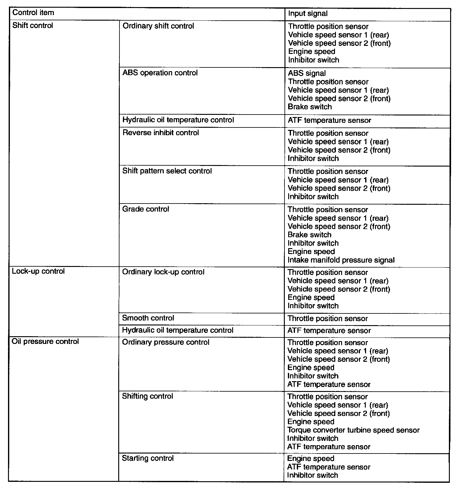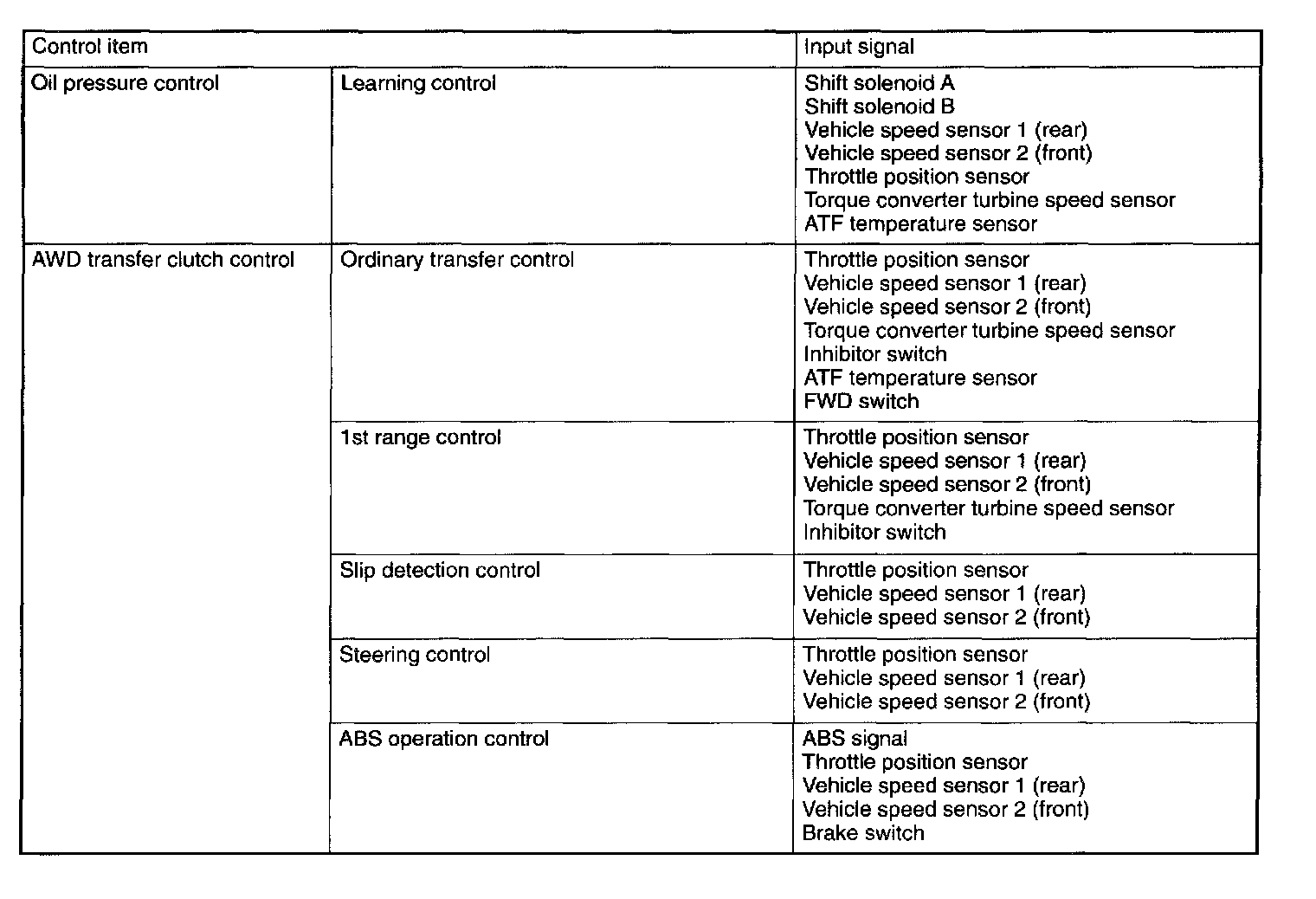 TCM receives various sensor signals and determines the running conditions of the vehicle. It then sends control signals to each solenoid according to the preset gearshift characteristic data, lockup operation data, and transfer clutch torque data (duty ratio).