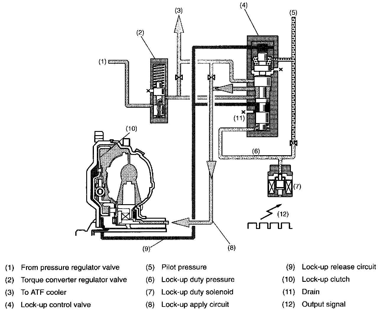 The lock-up duty solenoid is controlled by the TCM and controls the operation of the lock-up control valve. Because the lock-up operating pressure is controlled by the lock-up control valve, the force applied to the lock-up clutch is controlled for smooth clutch operation.