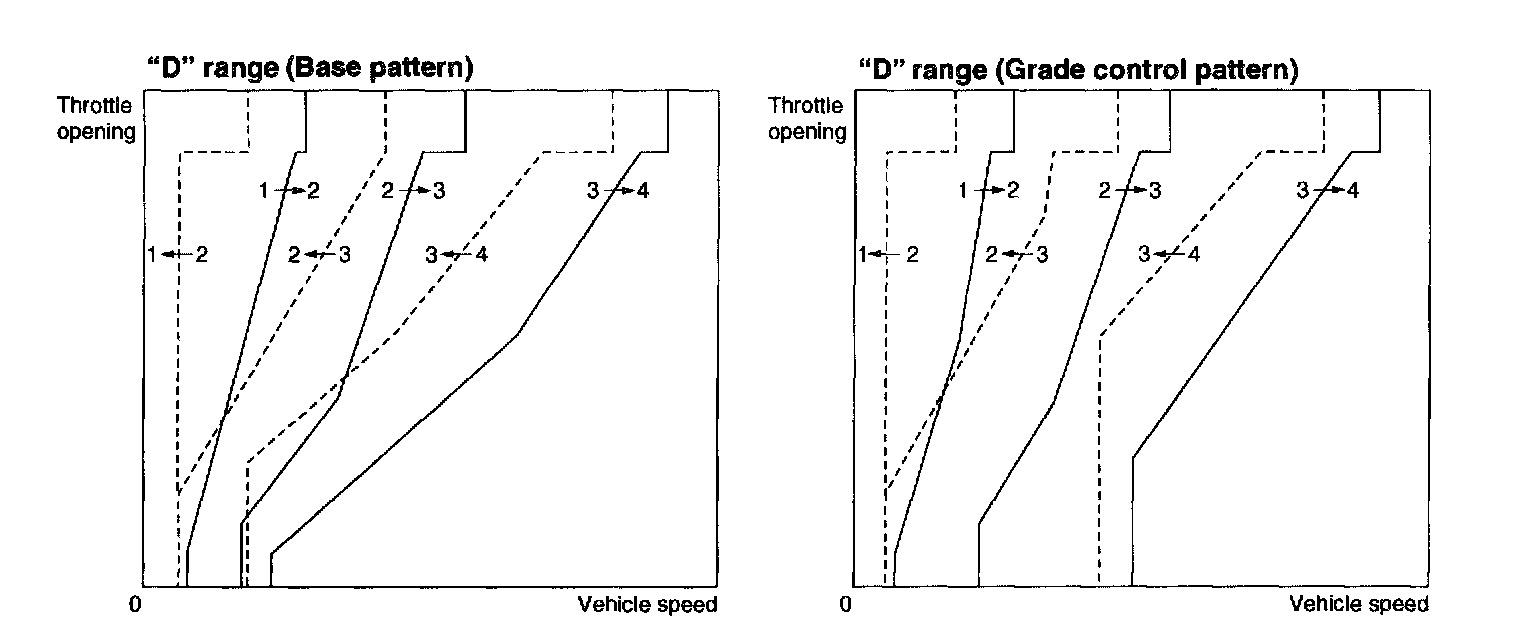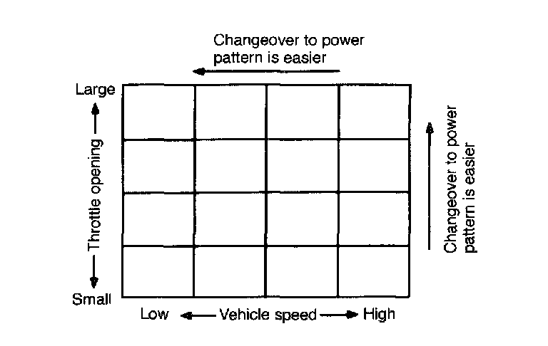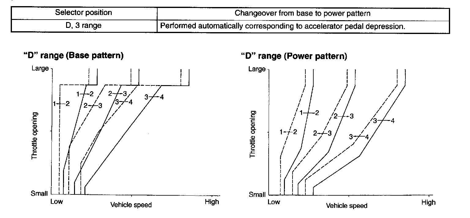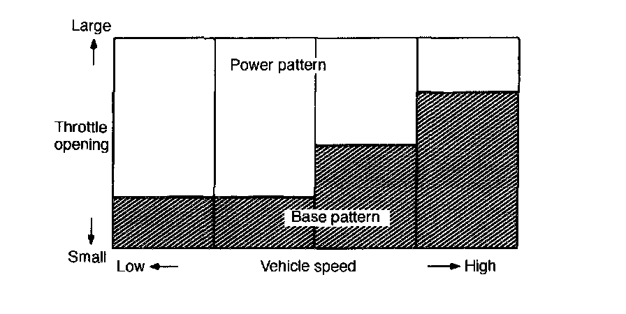 The power pattern is shifted to the base pattern, depending on car speed. Shifting to the base pattern is determined by the throttle position as shown in Figure below. Time lag in shifting is also determined by car speed. The maximum time lag is 3 seconds.