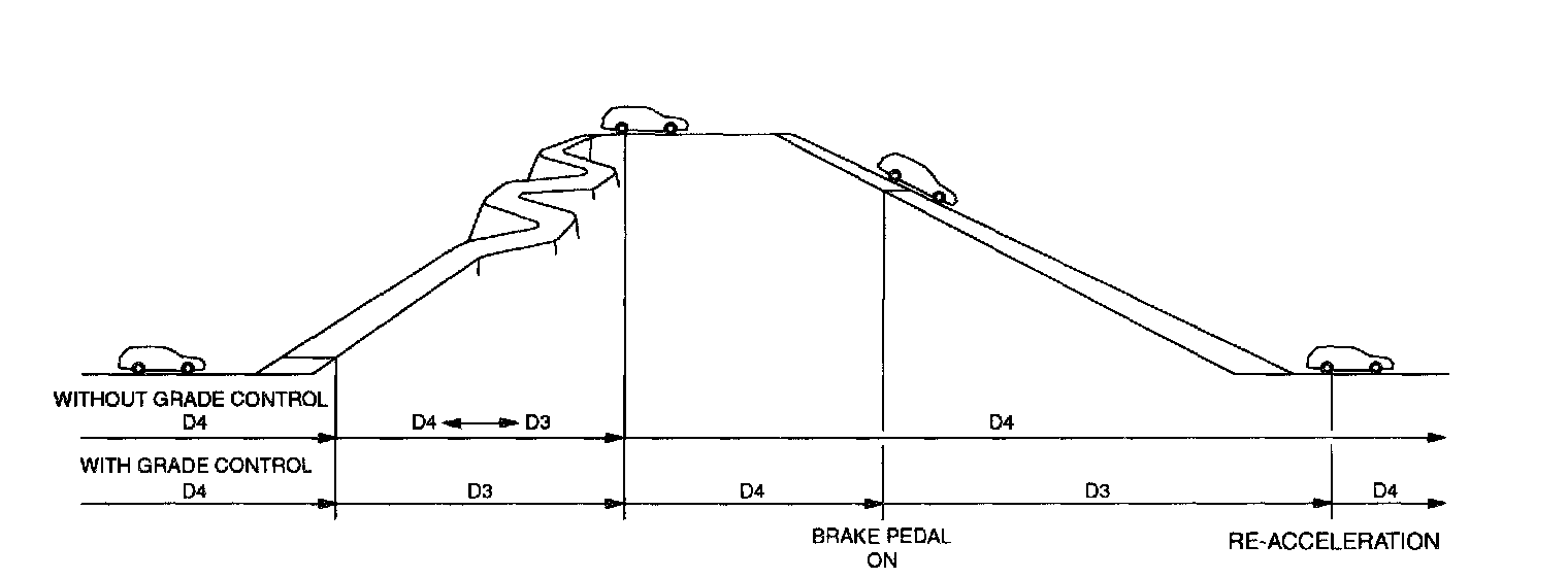 When a vehicle is descending a steep hill under the designated vehicle speed (approximately 50 miles/hour), 4th gear downshifts to 3rd gear automatically by depressing the brake pedal.