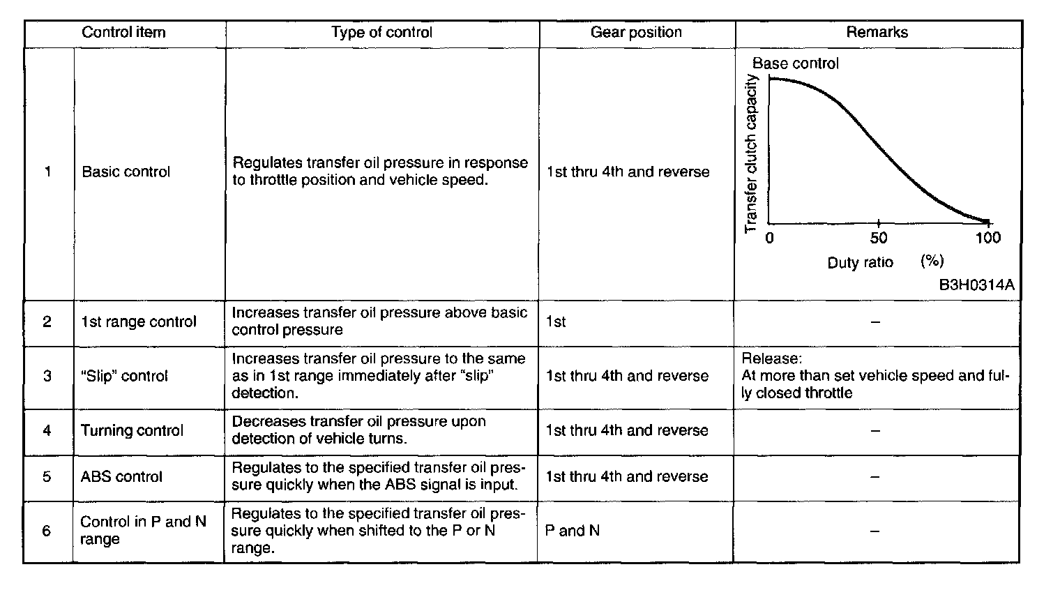 The hydraulic oil pressure (line pressure) is regulated by the transfer duty solenoid and transfer control valve for obtaining optimum rear torque distribution corresponding to the driving conditions.