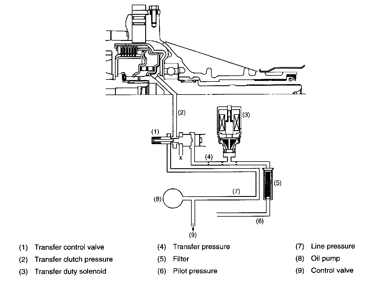^ The line pressure is led also to the transfer control valve where the pressure is regulated to the transfer clutch pressure by the transfer duty pressure. (The transfer clutch pressure varies with the transfer duty pressure.)