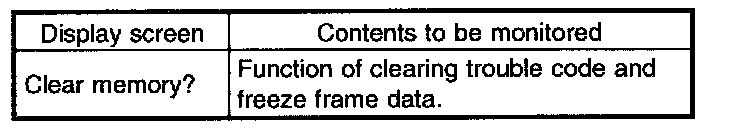 - If freeze frame data is not properly stored in memory (due to a drop in ABSCM power supply, etc.), a freeze frame data, preceded by a question mark "?", appears on the select monitor display. This shows it may be an unreliable reading. The value of the freeze frame data will be written over, and the memory cannot be cleared.