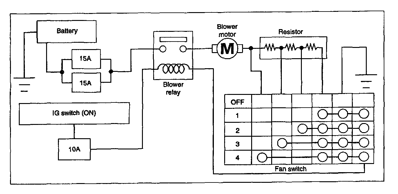 Operation of the blower relay is controlled by turning ON and OFF the ignition switch. When the ignition switch is ON and the fan switch is operated from 1st to 4th speed, electric current from the battery goes through the blower motor, the resistor, the fan switch and ground. The resistor is switched by the position of the fan switch, and controls the blower motor speed from 1st to 4th.