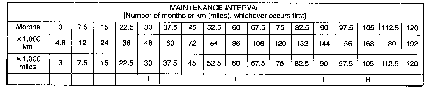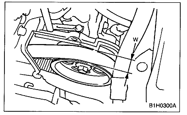 4. Measure timing belt width W. If it is less than 27 mm (1.06 in), check idlers, tensioner, water pump pulley and cam sprocket to determine idler alignment (squareness). Replace worn timing belt.