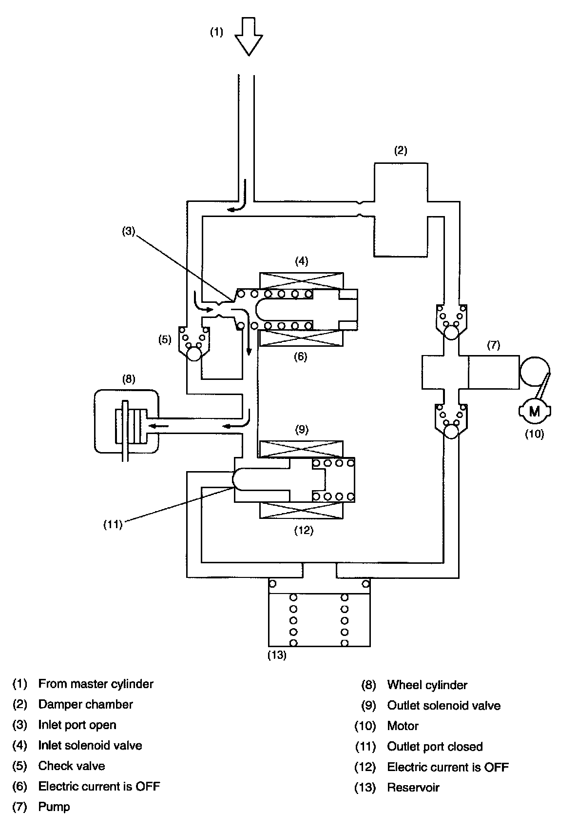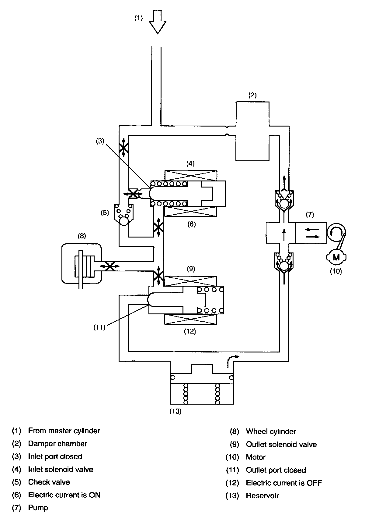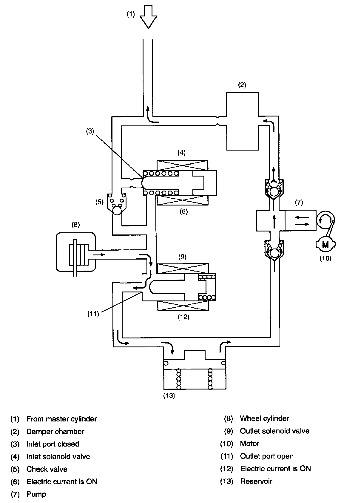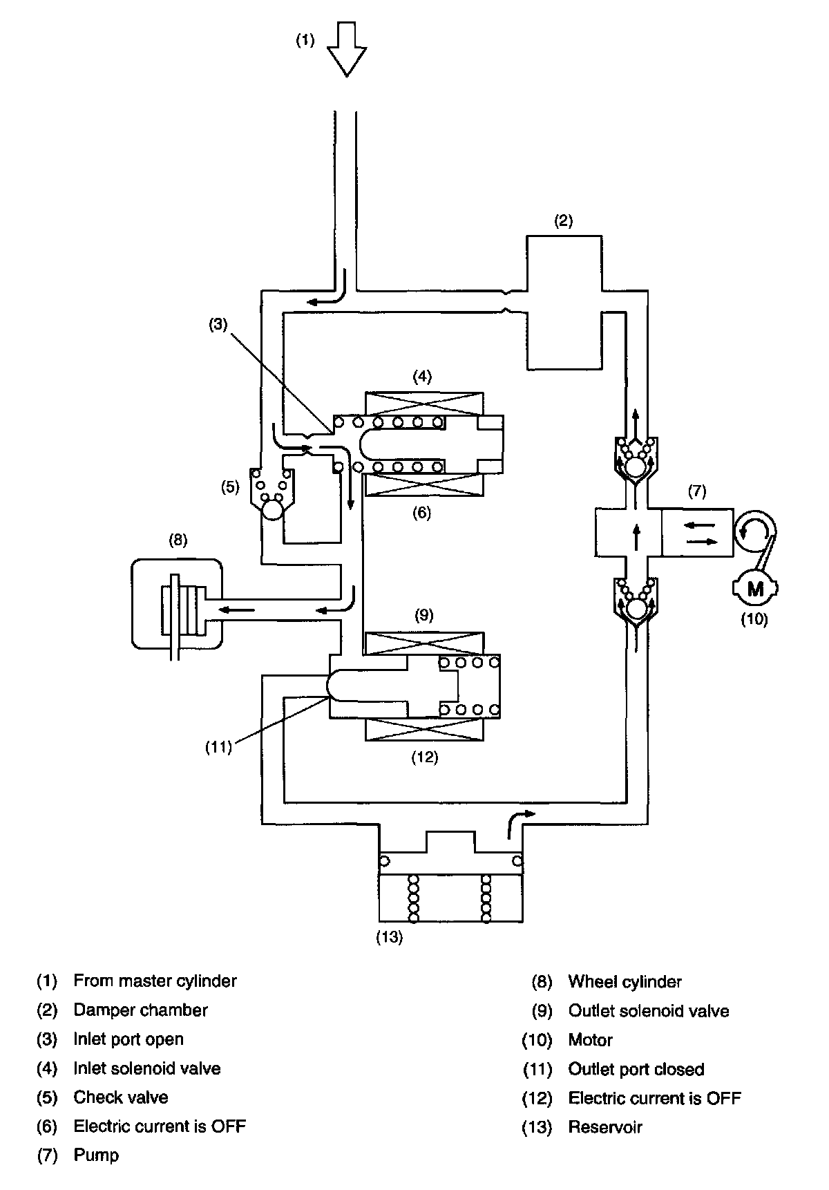 - The solenoid valve is a 2-position type solenoid valve which switches the brake fluid passages between the wheel and master cylinder and reservoir sides in response to an instruction from the ABSCM.