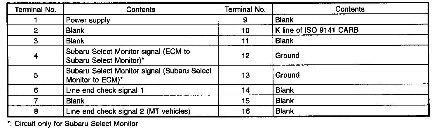 1. This connector is used both for OBD-II general scan tools and the Subaru Select Monitor.