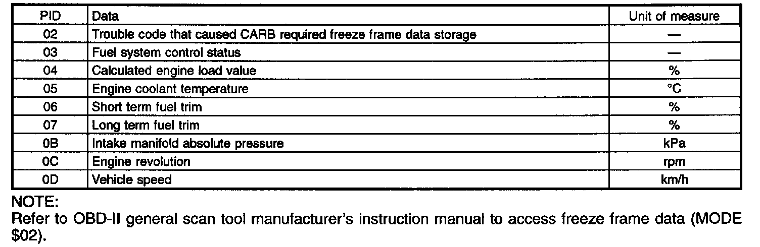 Refers to data denoting the operating condition when trouble is sensed by the on-board diagnosis system. A list of the support data and PID (Parameter Identification) codes are shown in the table.