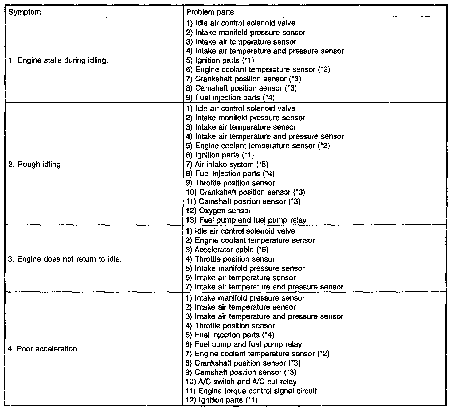 NOTE: Malfunction of parts other than those listed is also possible.*1: Check ignition coil & ignitor assembly and spark plug.