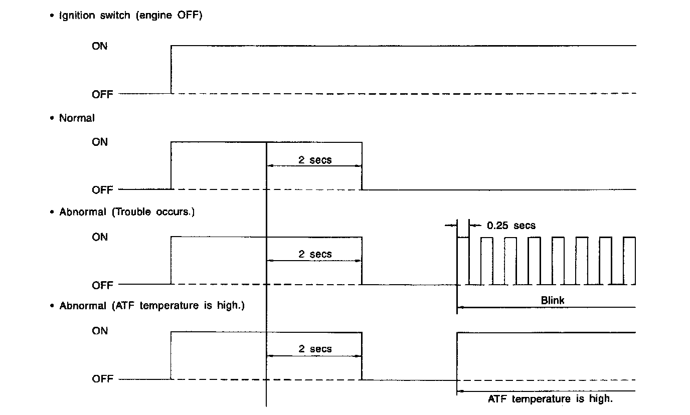 The malfunctioning part or unit can be determined by a trouble code during on-board diagnostics operation. Problems which occurred previously can also be identified through the memory function. If the AT OIL TEMP warning does not show a problem (although a problem is occurring), the problem can be determined by checking the performance characteristics of each sensor using the select monitor. Indicator signal is as shown in the figure.
